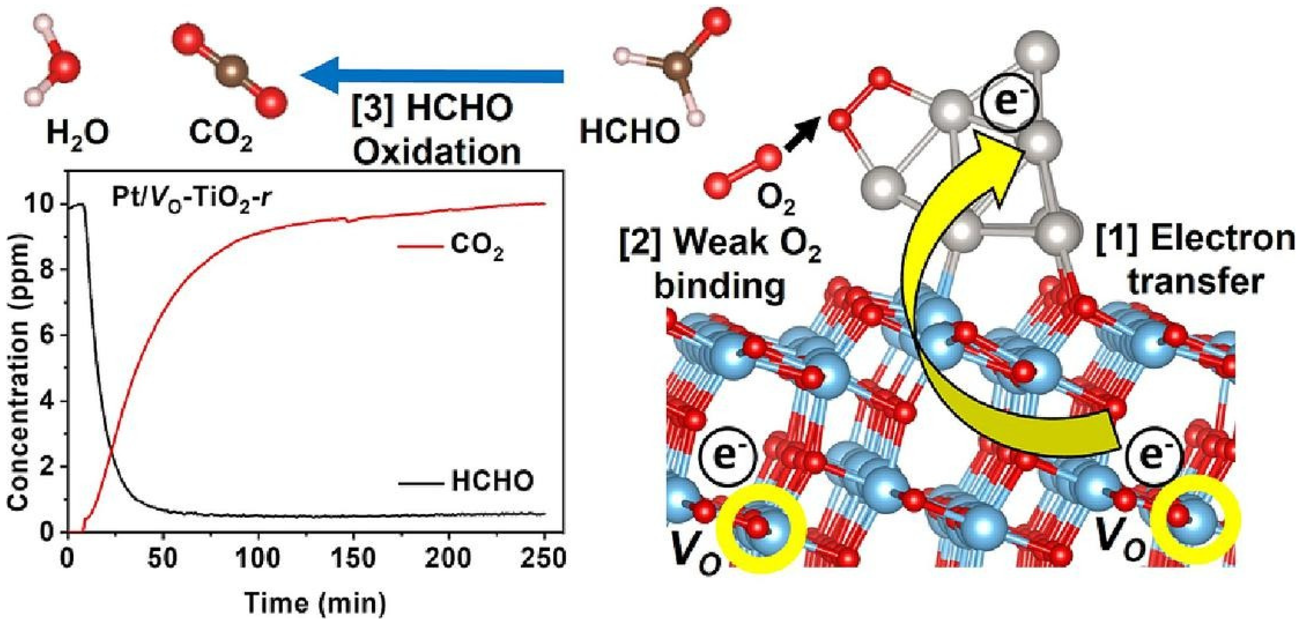 - Ahmad, W.; Jeong, H.; Nahm, H.H.; Lee, Y.; Park, E.; Lee, H.; Ali, G.; Kim, Y.H.; Jurng, J.; Oh, Y. Metal-anchoring, metal oxidation-resistance, and electron transfer behavior of oxygen vacancy-rich TiO2 in supported noble metal catalyst for room temperature HCHO conversion. Chem. Eng. J. 2023, 467, 143412. [Google Scholar] [CrossRef]