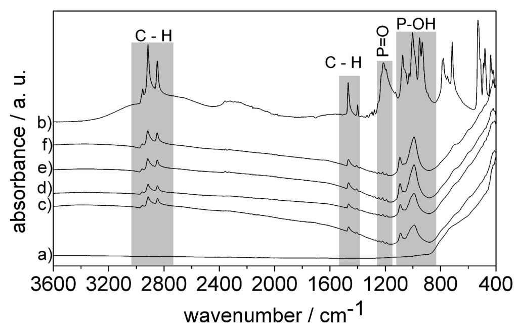 FTIR-spectra: (a) starting material titania; (b) coupling agent dodecylphosphonic acid and samples after the milling process: (c) 300 rpm/12 h; (d) 300 rpm/24 h; (e) 300 rpm/36 h; (f) 300 rpm/48 h; surface modification has taken place after the milling process, which is indicated by the characteristic bands for the C–H oscillation (1450 cm−1 and 2900 cm−1) and the wide band at 1000 cm−1 (P–O region).