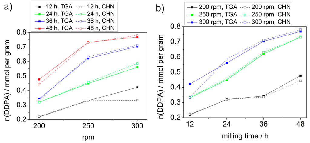 Surface modification in dependence of (a) the rpm or (b) the milling time, results calculated from TG analyses (straight line) and from CHN analyses (dashed line).