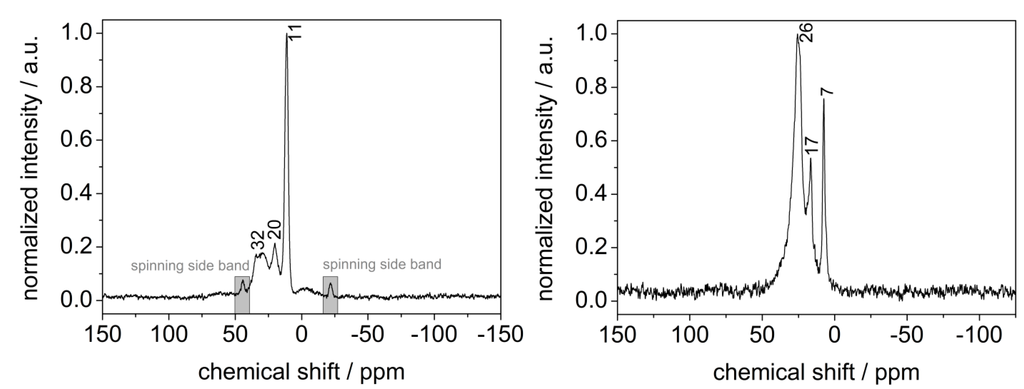 CP-MAS 31P (left) and 13C (right) spectra of titania milled with dodecylphosphonic acid at 200 rpm for 48 h.
