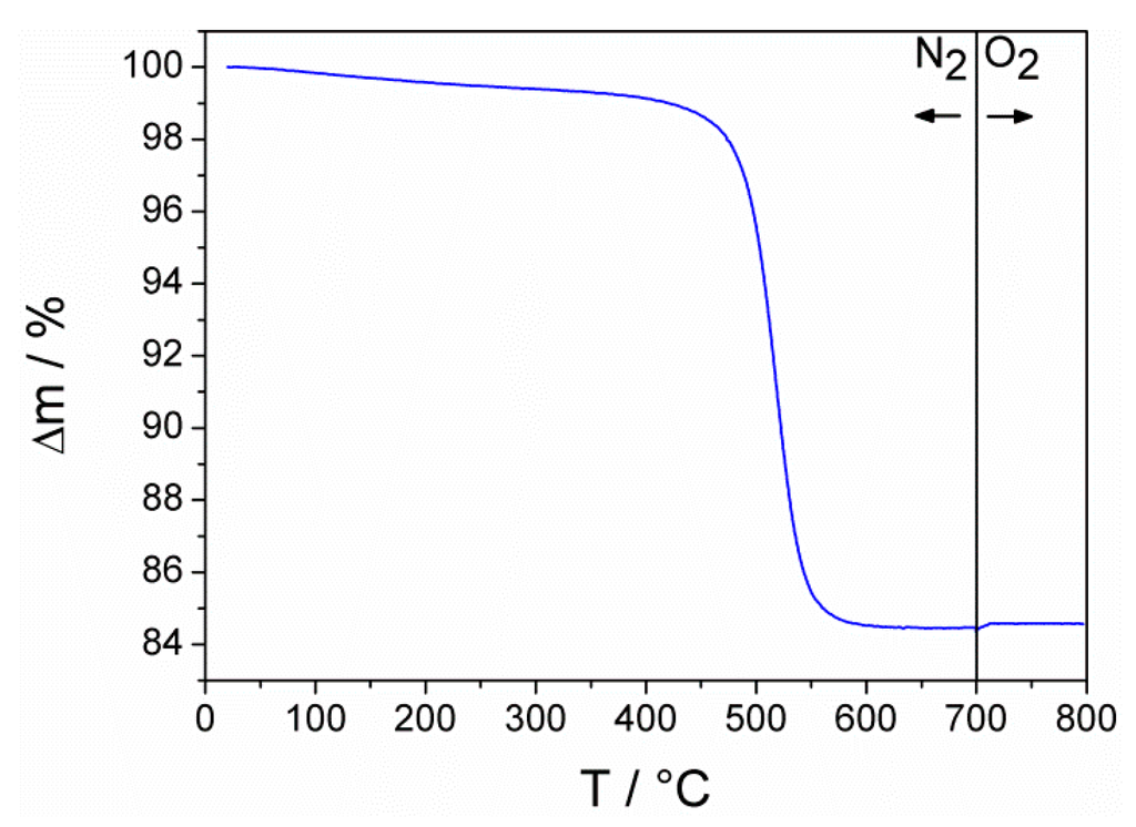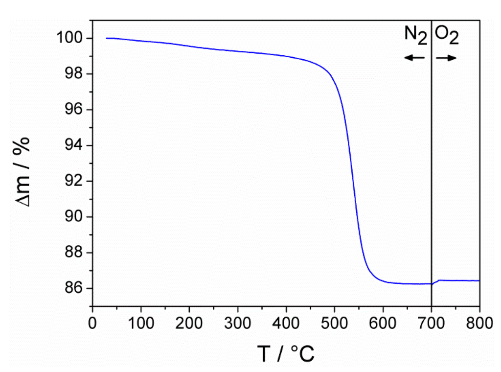 Thermal gravimetric analysis (TGA) of a sample obtained by reactive milling of titania with DDPA. All samples reveal the same TGA profile and differ only in the overall mass loss. The following figure shows the sample which was exposed to the highest energy impact (300 rpm, 48 h).