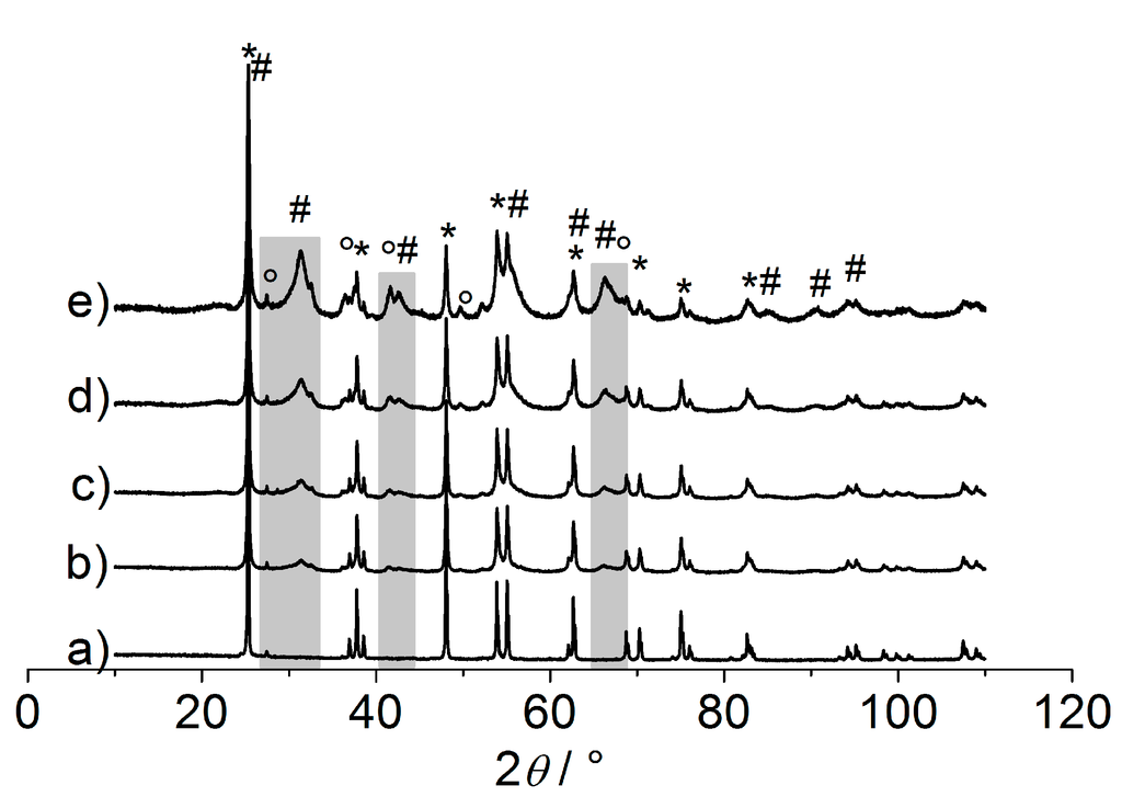 XRD patterns of (a) the starting material anatase (*) and some samples after milling with dodecylphosphonic acid (DDPA): (b) 300 rpm/12 h; (c) 300 rpm/24 h; (d) 300 rpm/36 h; (e) 300 rpm/48 h. The selection indicates the main differences in the reflections: The presence of high-pressure TiO2 (#) (2θ = 31°, 42° and 66°) and rutile (°) (2θ = 27°) is indicated by additional reflections.