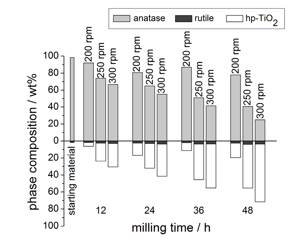 Additional to the qualitatively visible change in the reflection intensity a quantitative Rietveld phase analysis was performed. The development of the background gives no evidence for the presence of an amorphous phase. Nevertheless, the presence of such a phase cannot be excluded but if it should be present its proportion is estimated to be less than 5%. The summarized results are presented in Figure 6 and some results are listed in Table 1 (see also Supplementary Information Table S1). The Rietveld analysis confirms that the fraction of rutile and high-pressure TiO2 increases with longer milling time and higher milling speed.