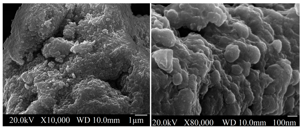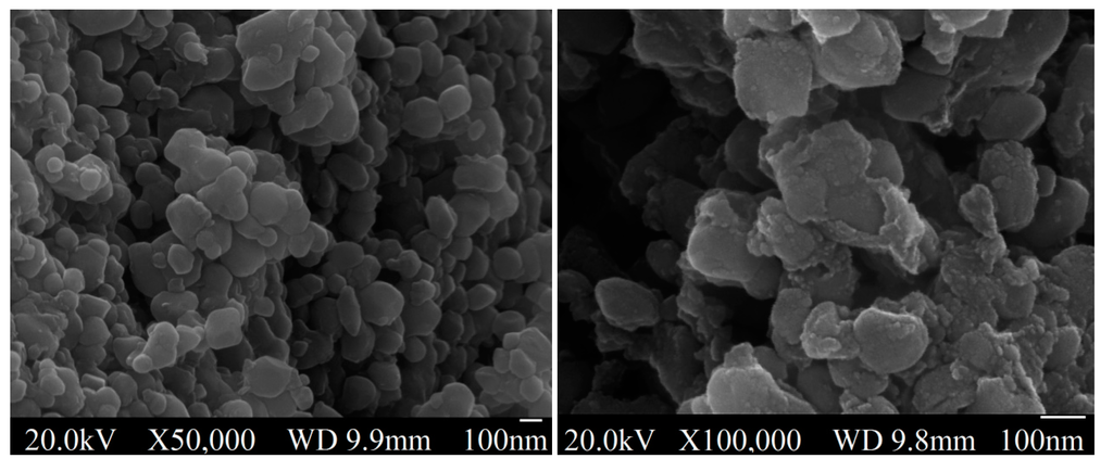 Besides the surface functionalization and phase transition, further important characteristics of the samples are the crystallite as well as the particle size. The crystallite sizes were derived from XRD pattern applying the Pawley method. The starting material was granular crystalline anatase, which exhibits crystallite sizes above 300 nm. The high-pressure TiO2 formed during the milling process has crystallite sizes around 6 nm but the residual anatase phase remains in the granular crystalline dimension. Compared to the starting material there is only a reduction of about 100 nm. For the rutile phase no reliable refinement of crystallite size could be performed due to the low percentage of this phase in the mixture. These results show that the milling time and the rotational speed primarily have influence on the phase transition but not on the particle size. Regardless of how the process parameters were selected, the resulting high-pressure TiO2 is nano crystalline and the residual anatase remains as granular crystalline. Furthermore, the morphology of the obtained samples was analyzed applying SEM measurements (Figure 7). The SEM images display that the particles are not uniformly shaped and agglomerated with particle sizes in a range of 100–300 nm. It is evident that the particle size decreases with increasing milling time and rotational speed.