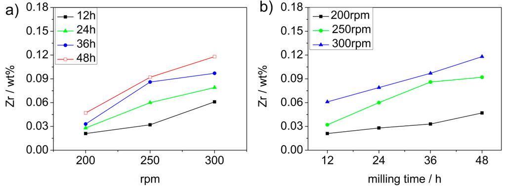 Due to abrasion of the grinding bowl, a contamination of the samples cannot be avoided but it is expected to be insignificantly small. X-ray fluorescence spectroscopy was used to analyze these impurities (Figure 8). The results confirm that the contamination of the samples due to abrasion of the grinding bowl is negligible. The contamination increases with increasing milling time and rotational speed.