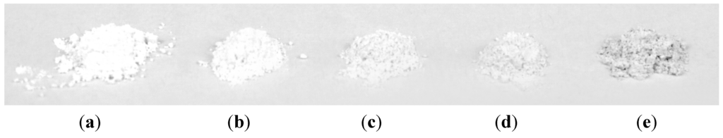 Images of some selected samples: (a) TiO2 (b) 200 rpm/12 h (c) 200 rpm/48 h (d) 300 rpm/12 h (e) 300 rpm/48 h. The grey discoloration increases with increasing energy input.