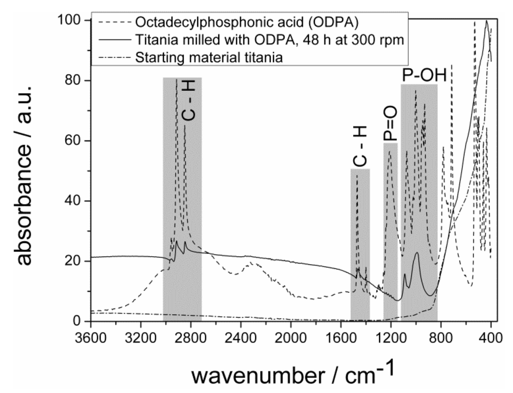 Surface modified particles are important building blocks for various applications in optics [1], electronics [2], material science [3] and in the biomedical field [4]. For this reason, there is increasing interest in economic synthetic strategies. In this context, there has been significant interest in mechanochemical approaches [5,6]. Reactive milling turned out to be a promising technique because it is a solvent-free and environmentally friendly alternative to conventional synthetic strategies [7,8]. Reactive milling has proven its suitability for the synthesis of various materials, for example calcium hydride by reactive milling of calcium and phenylphosphonic acid (PPA) under an inert atmosphere [9] or ZrTiO4 [10] to name only two examples out of many others. Recently, we investigated the suitability of reactive milling for the preparation of surface functionalized titania nanoparticles. We were able to show that an in situ surface functionalization using PPA as coupling agent is possible and that the organophosphorus surface functionalization can stabilize crystallographic high-pressure phases [11,12]. Often the surface functionalization of particles with organic coupling agents involves the use of organic solvents; our technique allows a solvent free, ecologically more friendly approach. In case of PPA, the surface functionalization of titania can also be obtained in water as solvent [13]. This is not the case for long alkyl chain phosphonic acids. Here, definitely an organic solvent is necessary for the complete dissolution of the respective coupling agent [14,15]. This was the reason for us to expand our previous studies to this type of surface modifier. Dodecylphosphonic acid (DDPA) was used to perform a systematic study on the behavior at different process parameters. Afterwards, octadecylphosphonic acid (ODPA) was used to demonstrate that the approach is assignable on other long alkyl chain organophosphorus species.