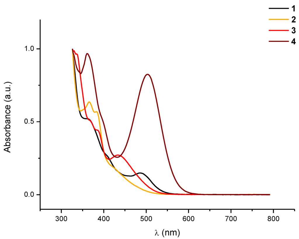 Differently to the analogous compounds [{Pt(bzq)(μ-C7H4NOS-κN,S)}2] (A1) and [{Pt(bzq)(μ-C7H4NS2-κN,S)}2] (A2), compound 1 showed no luminescence either in solid or in solution and, as expected, neither did the d7–d7 compounds 2–4.