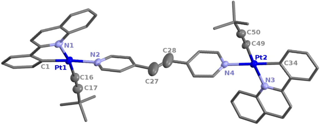 Single crystals suitable for X-ray analysis were grown by slow diffusing of n-hexane into a CHCl3 solution at −30 °C of 2a and 4a, respectively. The structures of [{Pt(pq)(μ-C≡CtBu)}2(μ-4,4'-bpy)]·2CHCl3·C6H14 (2a·2CHCl3·C6H14) and [{Pt(pq)(μ-C≡CtBu)}2(μ-bpe)]·4CHCl3 (4a·4CHCl3) were confirmed by X-ray crystallography (Figure 2, Figure 3 and Figure S1; Table 1 and Table S1). The asymmetric unit of 2a contains only one molecule, whereas in 4a the asymmetric unit is formed by one independent molecule together with two half molecules, which are completed by application of the symmetry elements. The conformation and metrical parameters of the three molecules are comparable, therefore, only the data for one of them are included in Table 1. The complexes are binuclear with a 4,4'-bpy (2a) or bpe (4a) group bridging the Pt(II) centers, which complete their distorted square planar environment with a bidentate pq ligand and one terminal alkynyl group. In both complexes, the N-pyridine bridging group is trans to the cyclometalated carbon, thus confirming that the reactions takes place with retention of the geometry in the precursor, and the Pt units adopt an anti-configuration.