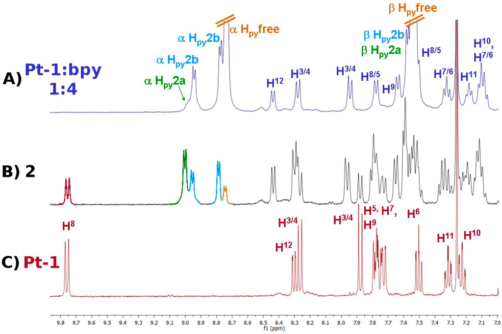 1H NMR spectra (CDCl3, 400 MHz, 298 K, aromatic region) of: (A) Aliquot of a reaction mixture Pt-1/4,4'-bpy in a 1:4 molar ratio; (B) Microcrystalline sample of [{Pt(pq)(C≡CtBu)}2(μ-4,4'-bpy)] (2a); (C) [Pt(pq)(μ−κCα:η2-C≡CtBu)]2 (Pt-1).