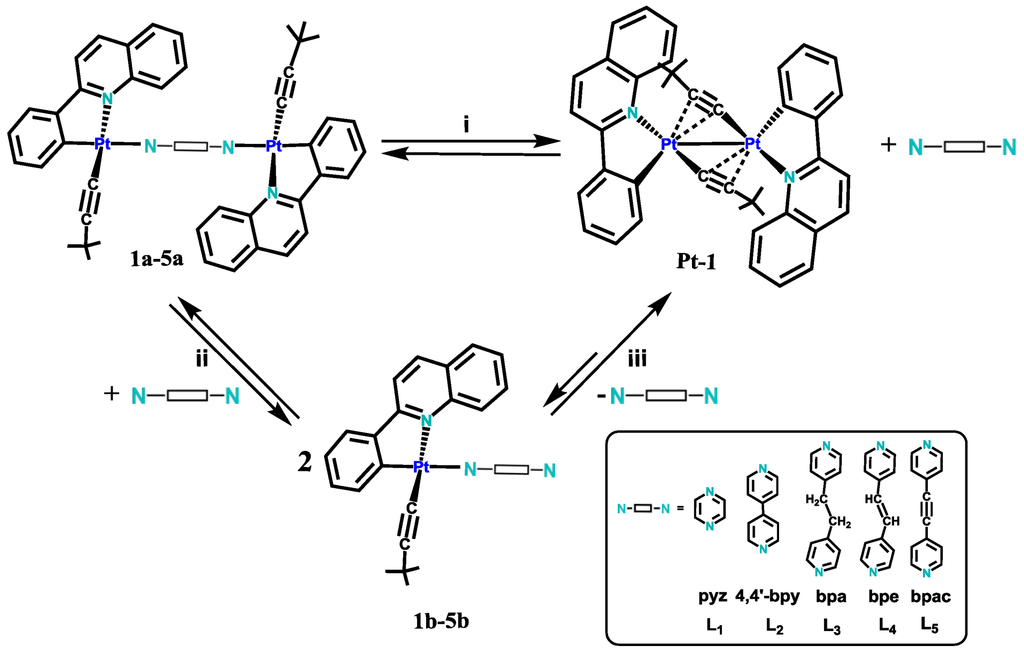 In this work, we study the reactivity of the ter-butyl derivative [Pt(pq)(μ-κCα:η2-C≡CR)]2 (Pt-1) towards bidentate and tridentate nitrogen linkers, assuming that both, the “Pt(pq)(C≡CtBu)” fragment and the linkers, are luminophores. This study has allowed us to synthesize a series of platinum(II) binuclear derivatives [{Pt(pq)(C≡CtBu)}2(μ-L)] bridged by N-N-donor ligands [L = pyrazine (pyz) 1a, 4,4'-bipyridine (bpy) 2a, 1,2-bis(bipyridyl)ethane (bpa) 3a, trans-1,2-bis(4-pyridyl)ethylene (bpe) 4a and 1,2-bis(4-pyridyl)acetylene (bpac) 5a], and the trinuclear branched derivative [{Pt(pq)(C≡CtBu)}3(μ-L)] (6a) containing the rigid conjugated pyridyl alkynyl ligand [μ-1,3,5-tris(pyridine-4-ylethynyl)benzene]. A combination of crystallography (2a and 4a), NMR, IR and mass spectrometry provides a complete picture of the equilibrium established in solution between derivatives with N-donor bridging ligands (1a–5a), mononuclear complexes with terminal N-ligands [Pt(pq)(C≡CtBu)(L-κN)] (1b–5b) and the precursor (Pt-1). Furthermore, we discuss the photophysical properties of these complexes in solid state and in solution and the theoretical calculations of 2a.