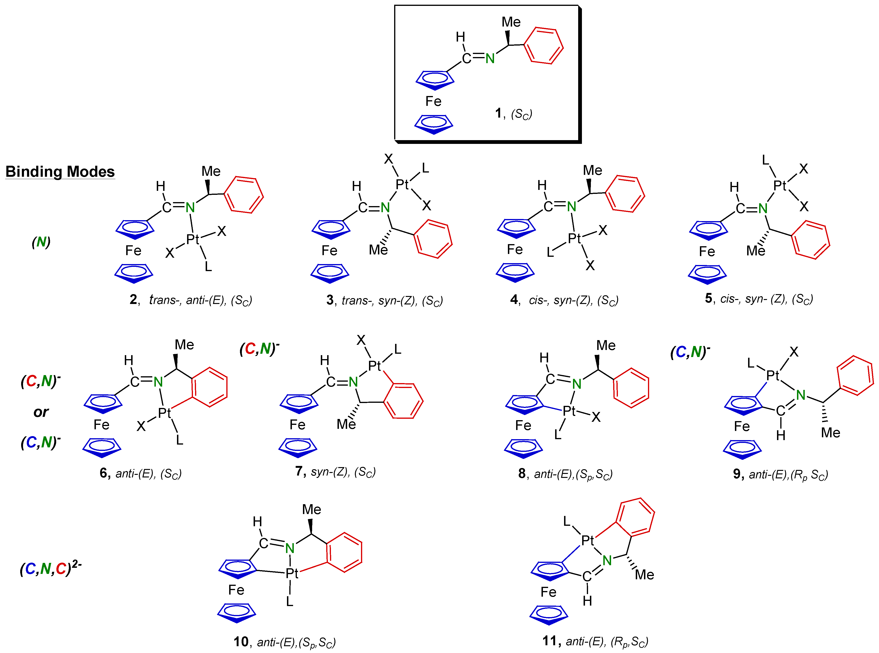 - López, C.; Caubet, A.; Pérez, S.; Solans, X.; Font-Bardía, M.; Molins, M. Chiral Platinum(II) Compounds Containing Ferrocenyl Schiff Bases Acting as (N), (N,O)−, [C(sp2,ferrocene),N]− or [C(sp2,ferrocene),N,O]2− Ligands. Eur. J. Inorg. Chem. 2006, 3974–3984. [Google Scholar]