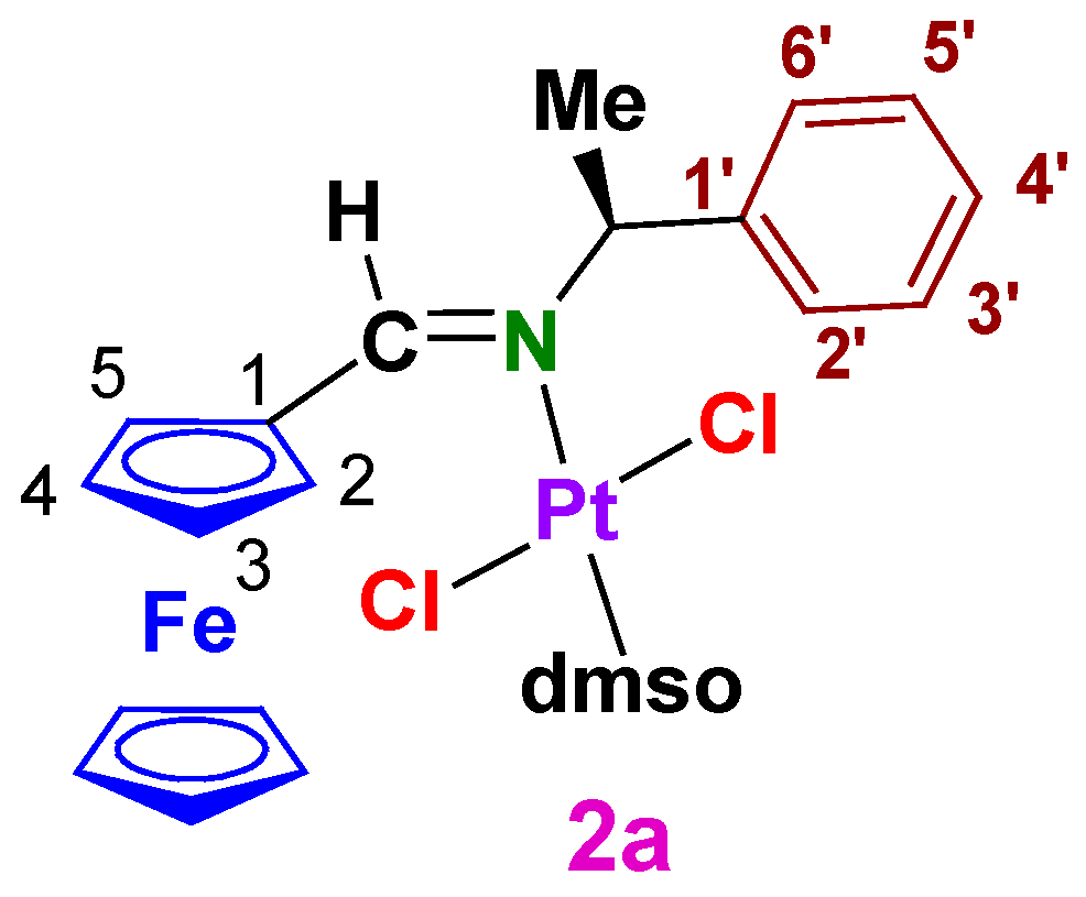 3.1.1. trans-(SC)-[Pt{κ1-N[FcC(H)=N−CH(Me)(C6H5)]}Cl2(dmso)] (2a)
