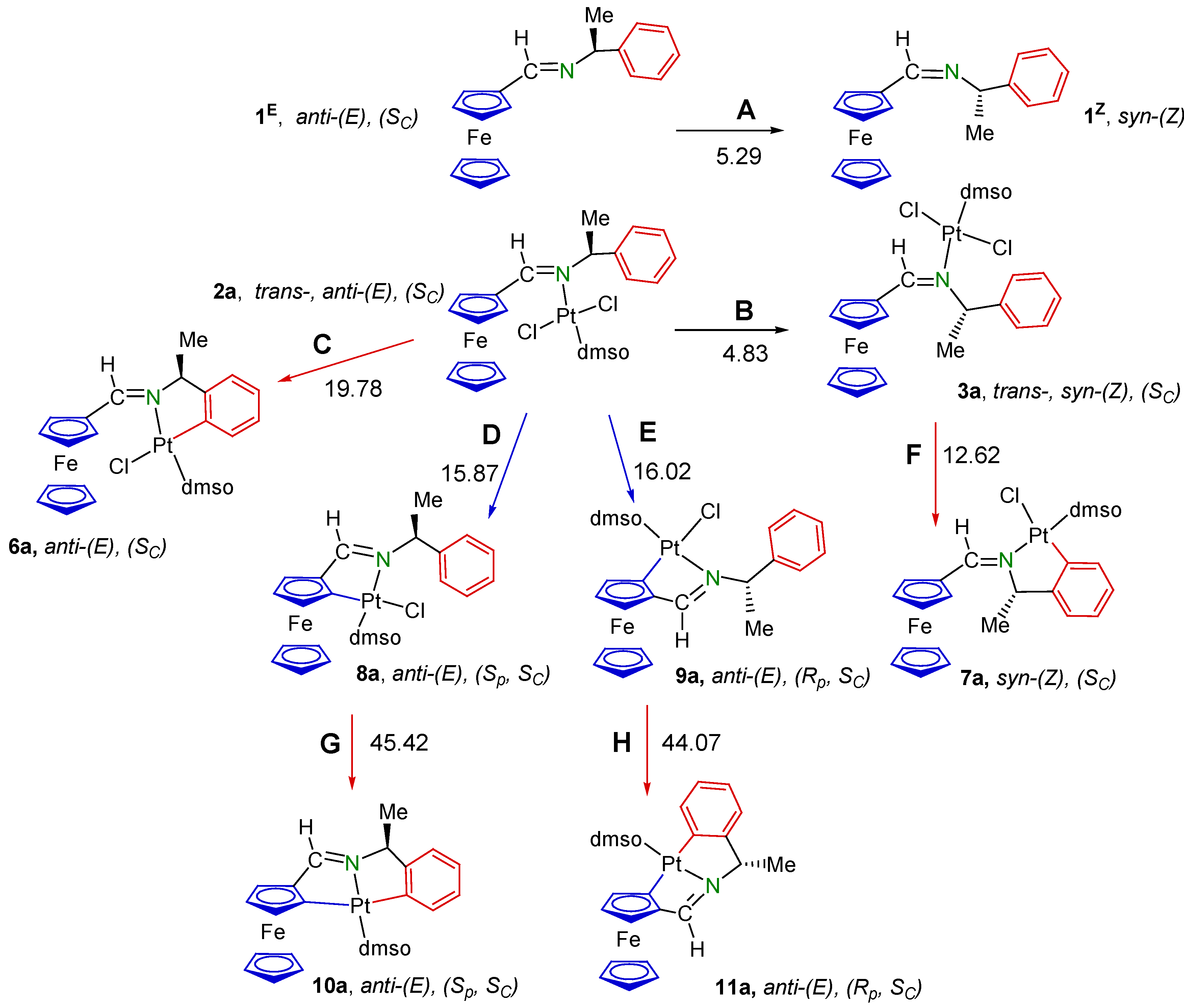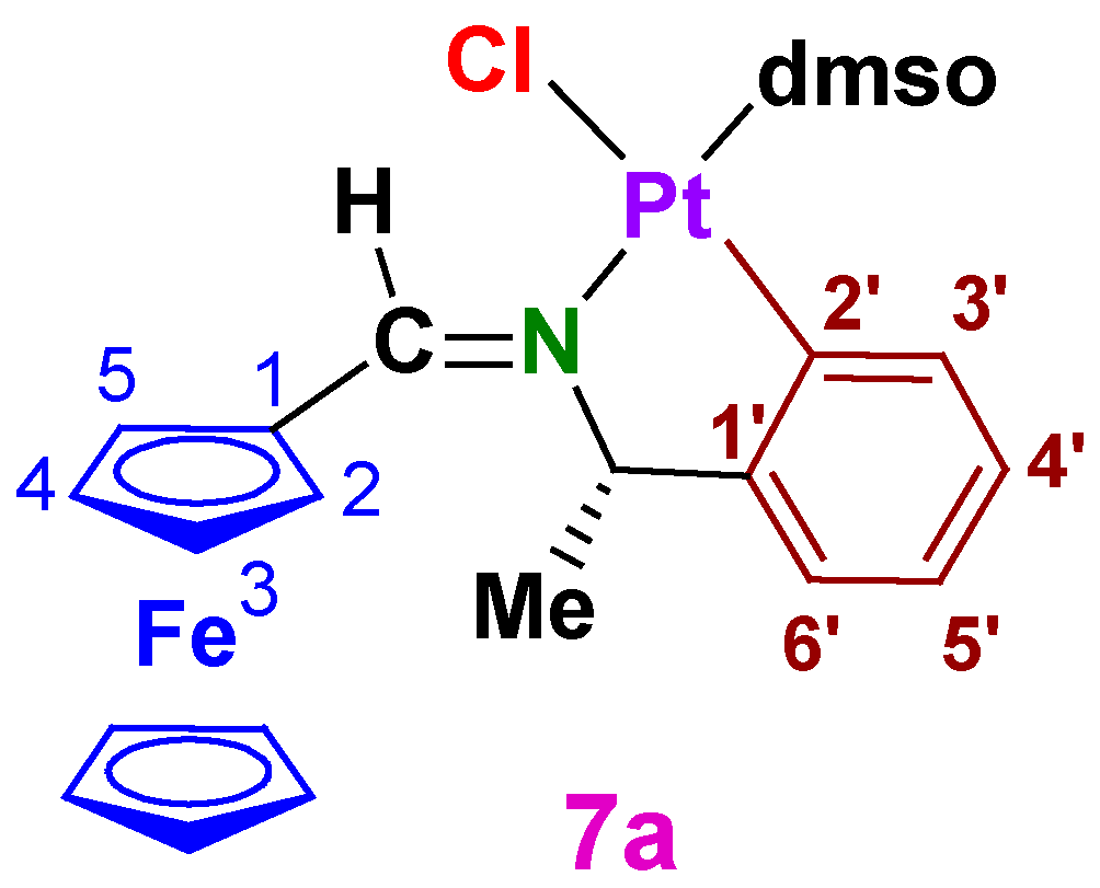 3.1.2. (SC)-[Pt{κ2-C,N[(C6H4)(Me)CHN=C(H)Fc]}Cl(dmso)] (7a)