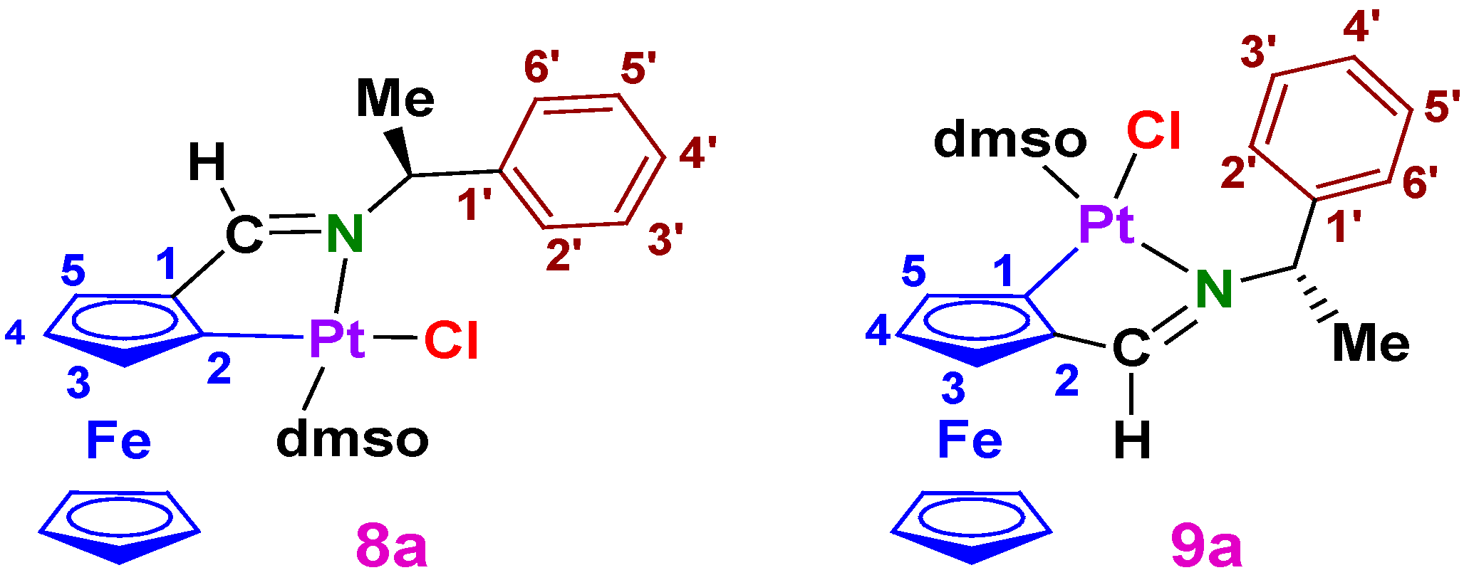 3.1.3. Synthesis of II {a Mixture of the (Sp, SC) and (Rp, SC) Diastereomers [Pt{κ2-C,N[(η5-C5H3)−CH=N−{CH(Me)(C6H5)}]Fe(η5-C5H5)}Cl(dmso)] (8a and 9a, respectively)