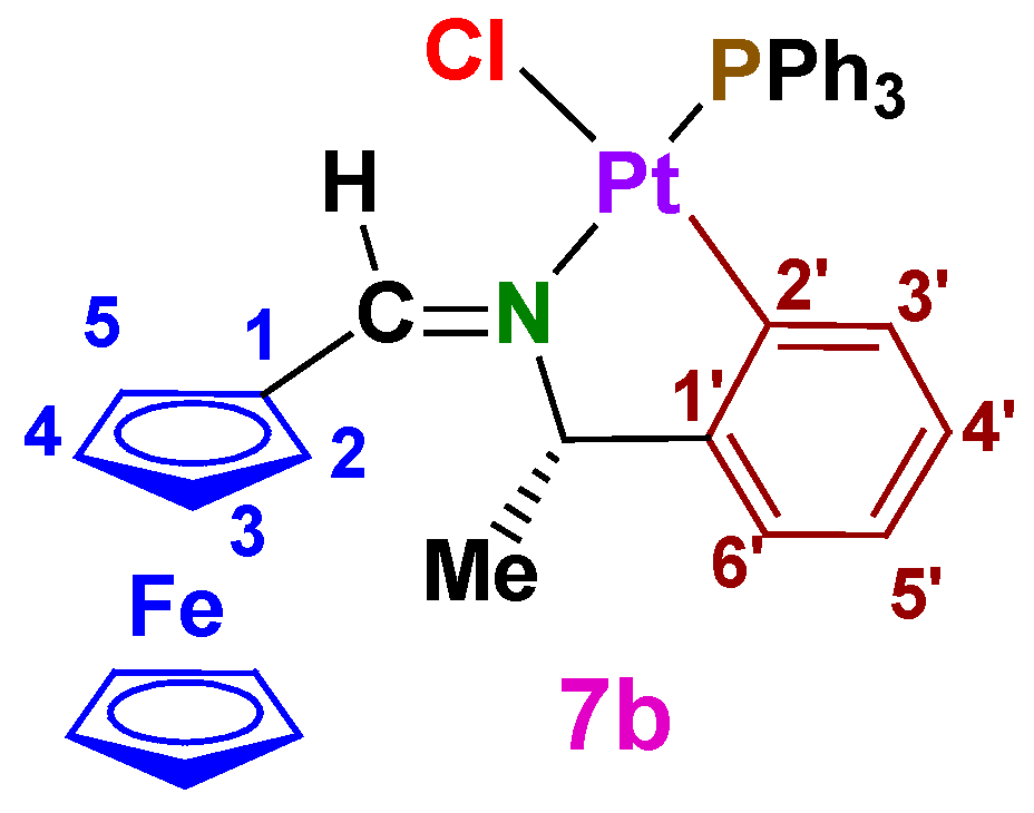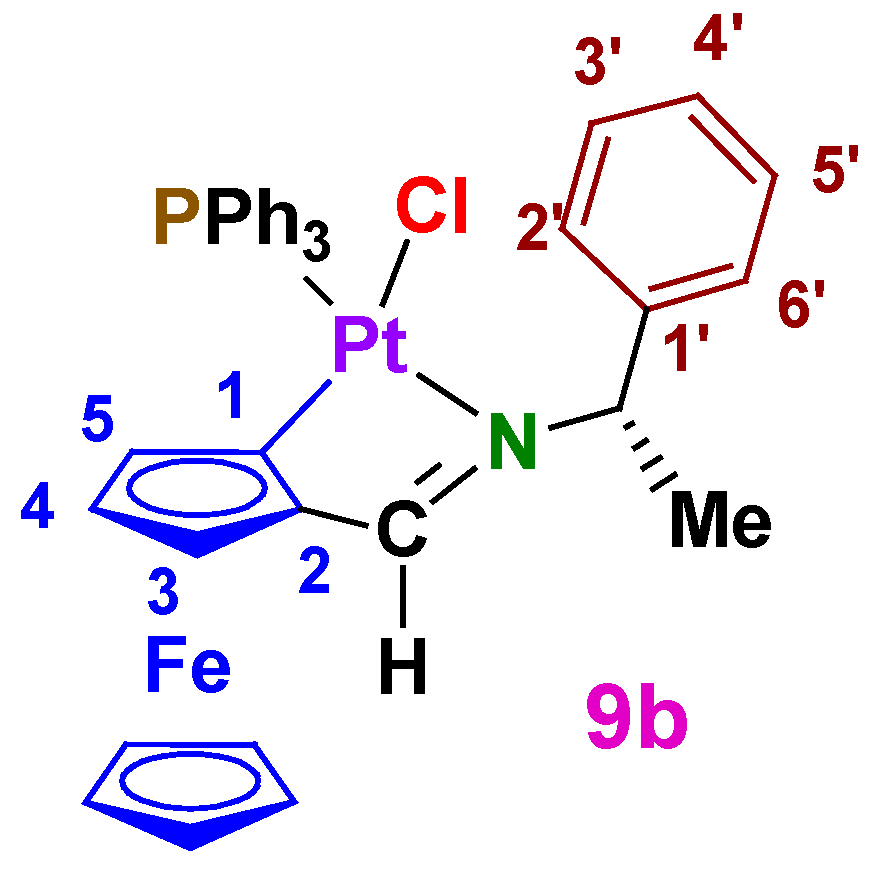3.1.6. Separation of the Diastereomers of [Pt{κ2-C,N[(η5-C5H3)−CH=N−CH(Me)(C6H4)]Fe(η5-C5H5)}Cl(PPh3)] (8b and 9b)