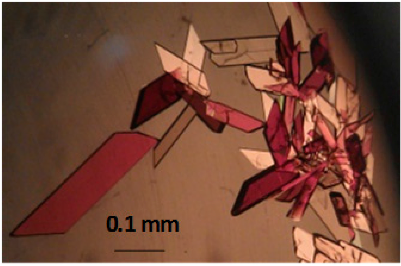 Picture of the crystals of NH4Mo6(AlePy2Mo)2 in the synthetic medium.