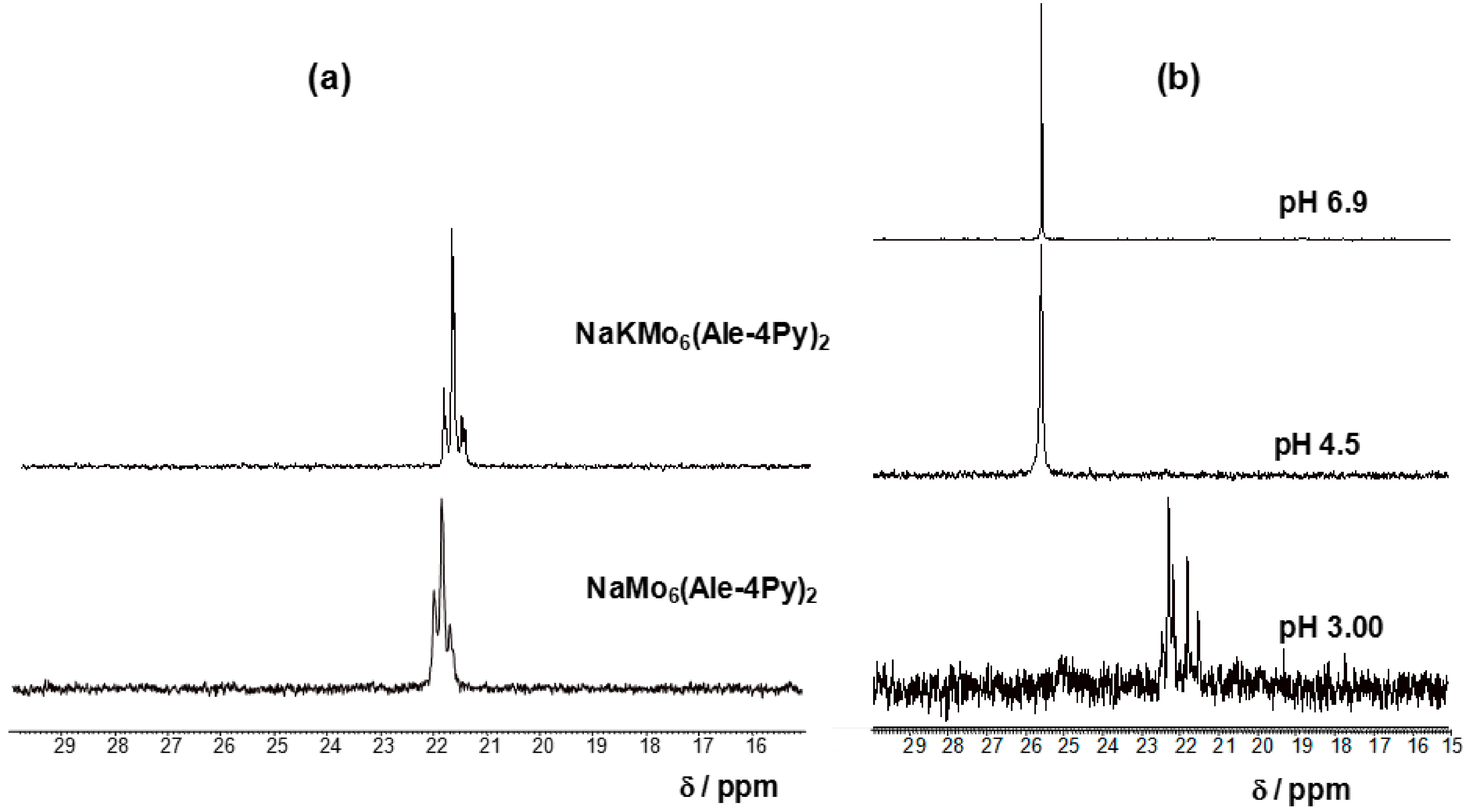 NaMo6(Ale-4Py)2 and NaKMo6(Ale-4Py)2 are insoluble in all common solvents. Therefore, it was not possible to investigate their stability in solution by 31P NMR spectroscopy. Nevertheless, it has been possible to record the 31P NMR spectra of the synthetic solutions (Figure 2a). Three peaks around 22 ppm are observed which can be tentatively attributed to the presence of conformers in equilibrium in solution [18].