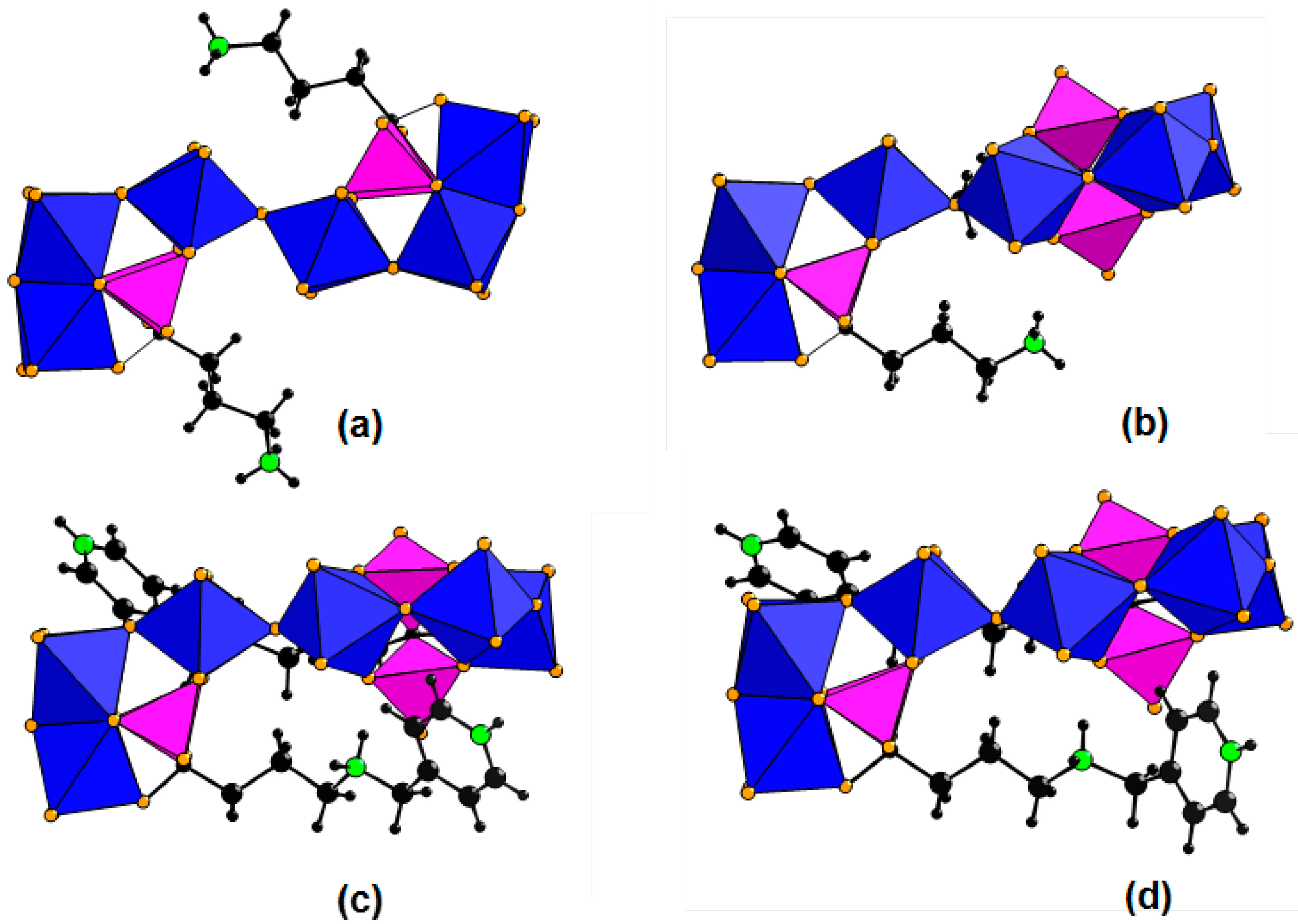 Mixed polyhedral/ball-and-stick representation of the hexanuclear POM of general formula [(MoVI3O8)2(O)(BP)2]n− in (a) Rb0.25(NH4)5.75[(MoVI3O8)2(O)(Ale)2]18 (A conformation), (b) Na6[(MoVI3O8)2(O)(Ale)2]24 (B conformation), (c) NaMo6(Ale-4Py)2 and (d) NaKMo6(Ale-4Py)2; blue octahedra: MoVIO6, pink tetrahedra: PO4, orange spheres: O, black spheres: C, green spheres: N.