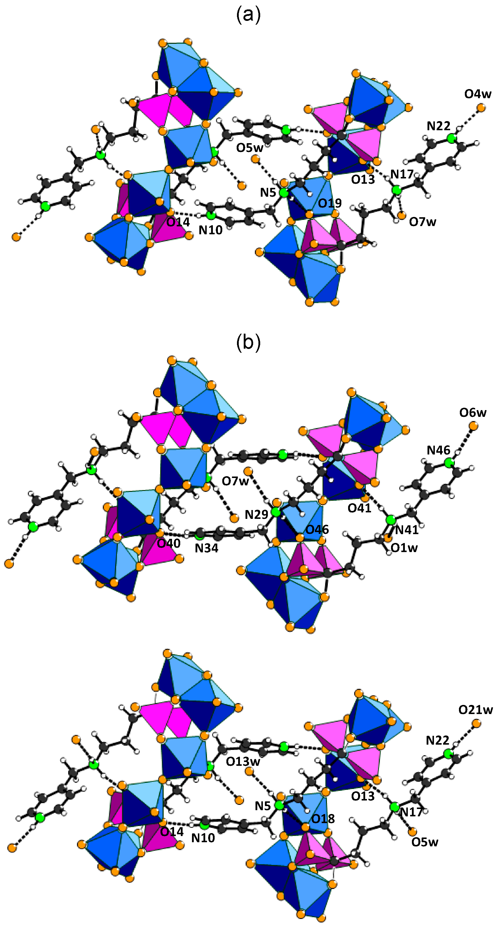 Hydrogen bonding schemes involving the supramolecular dimers {Mo6(Ale-4Py)2}2 in (a) NaMo6(Ale-4Py)2 and (b) NaKMo6(Ale-4Py)2.