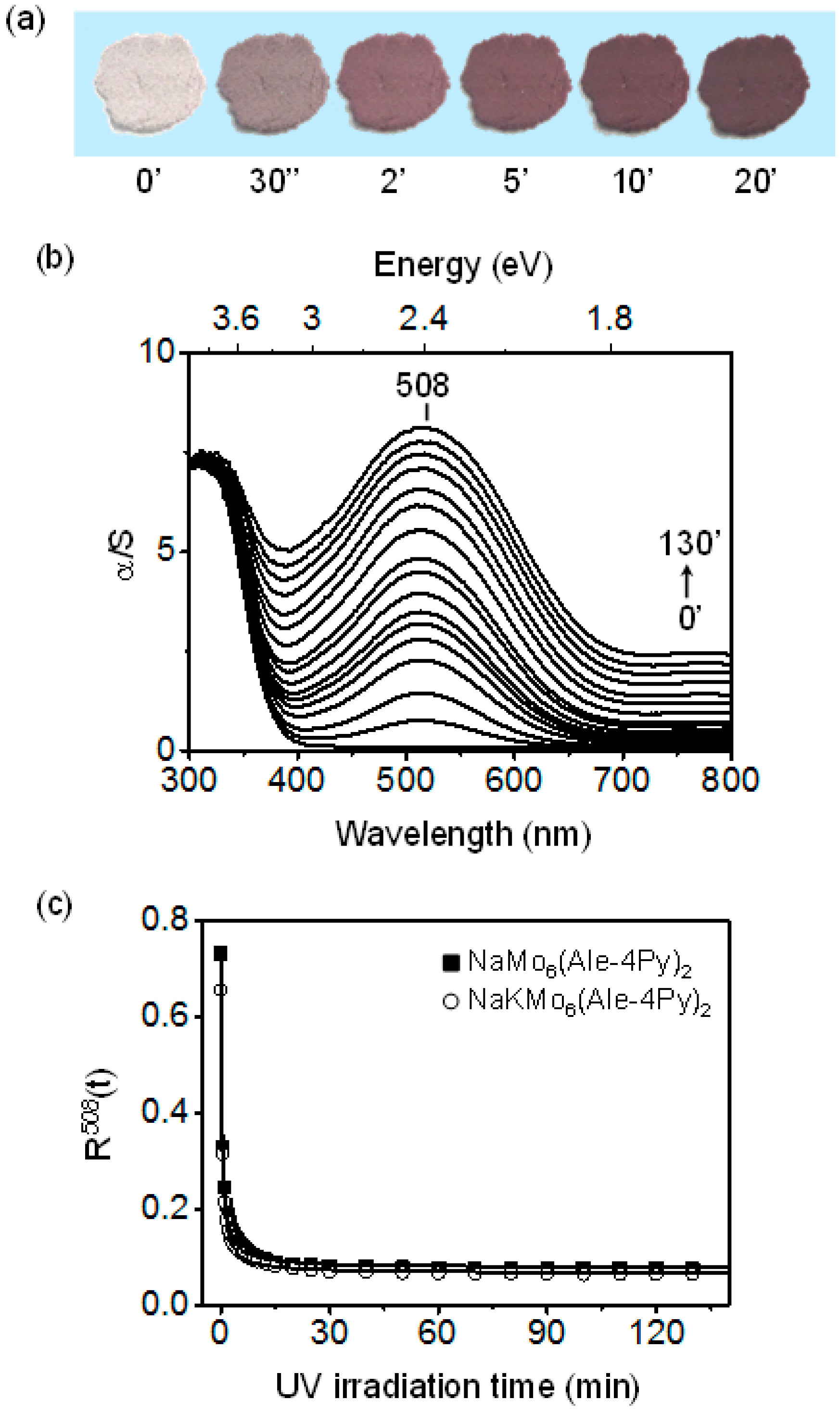 (a) Photographs of the powder of NaKMo6(Ale-4Py)2 at different UV irradiation time (in min). (b) Evolution of the photo-generated absorption in NaKMo6(Ale-4Py)2 after 0, 0.5, 1, 2, 3, 4, 5, 7, 10, 15, 20, 30, 40, 60, 80, 100 and 130 min of UV irradiation (λex = 365 nm). (c) Comparison of the R508(t) vs. t plots for NaMo6(Ale-4Py)2 (■), and NaKMo6(Ale-4Py)2 (○). The lines show the fits of the plots according to rate law R508(t) = a/(bt + 1) + (R508(0) − a).