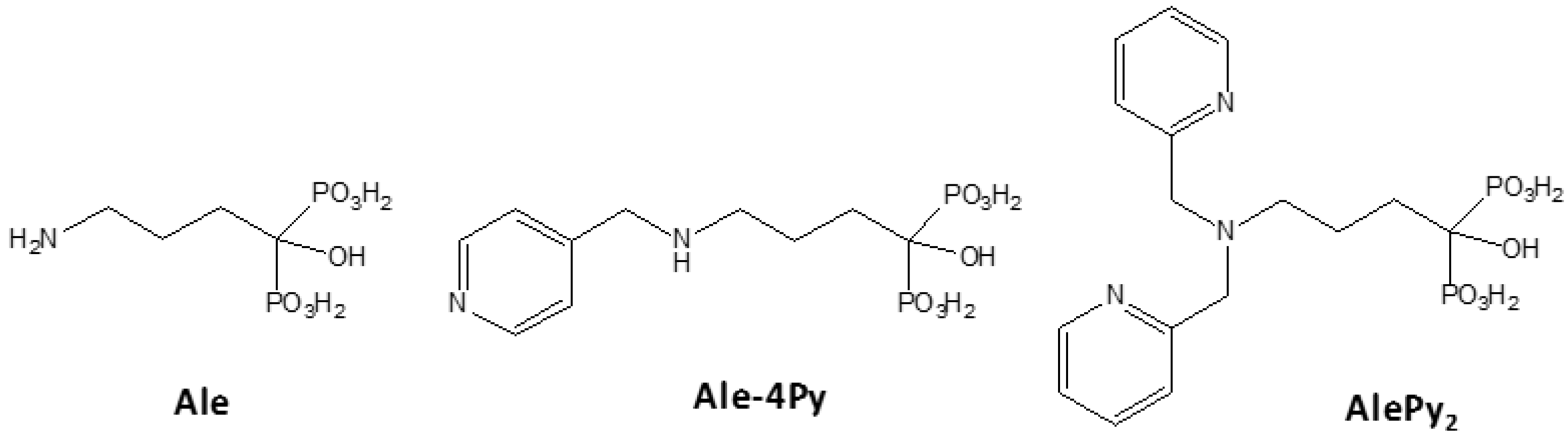 - Kubícek, V.; Kotek, J.; Hermann, P.; Lukeš, I. Aminoalkylbis(phosphonates): Their Complexation Properties in Solution and in the Solid State. Eur. J. Inorg. Chem. 2007, 333–344. [Google Scholar] [CrossRef]