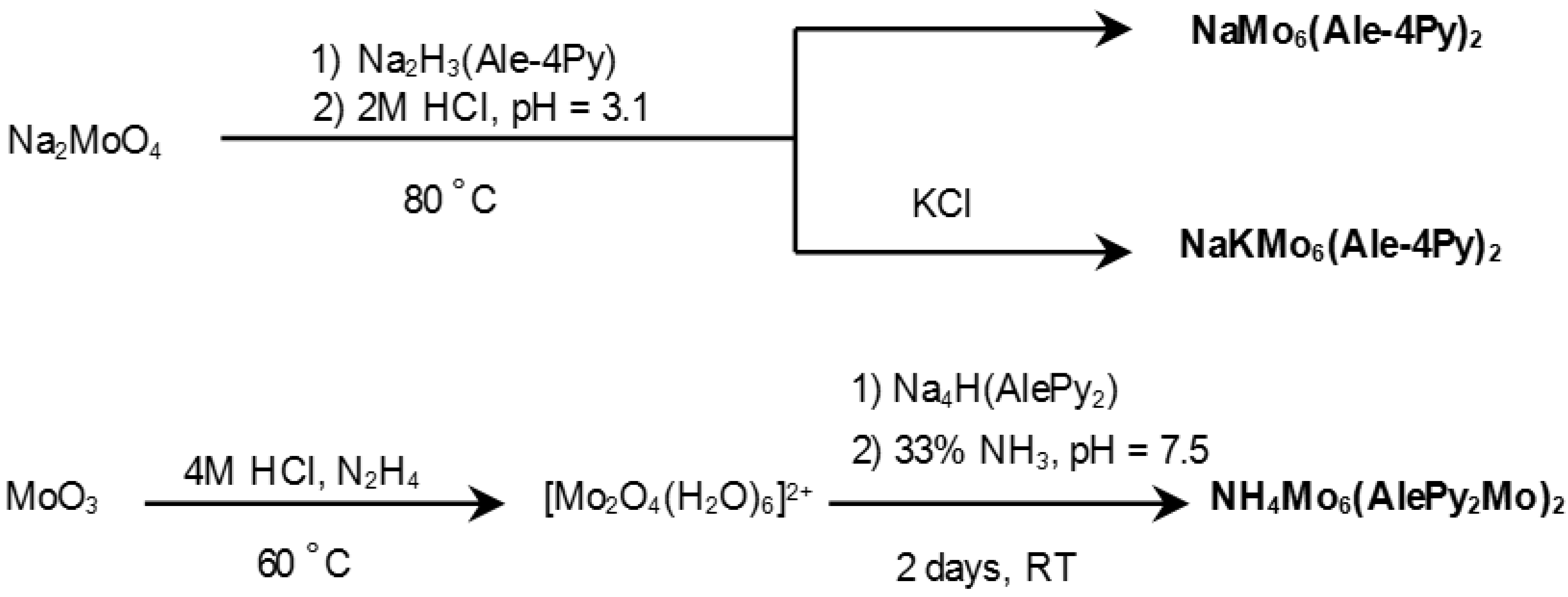 The alendronic acid H2O3PC(OH)(C3H6NH2)PO3H2 (Ale) [27] and its derivative Na4[O3PC(OH)(C3H6N(CH2C5H4N)2)PO3] (Na4HAlePy2) [28] were synthesized according to reported procedures. All other chemicals were used as purchased without purification. Ale-4Py and AlePy2 were reacted with MoVI and MoV precursors. However, only the reactions of Ale-4Py with MoVI and AlePy2 with MoV led to crystalline compounds which could be characterized by single-crystal X-ray diffraction analysis.