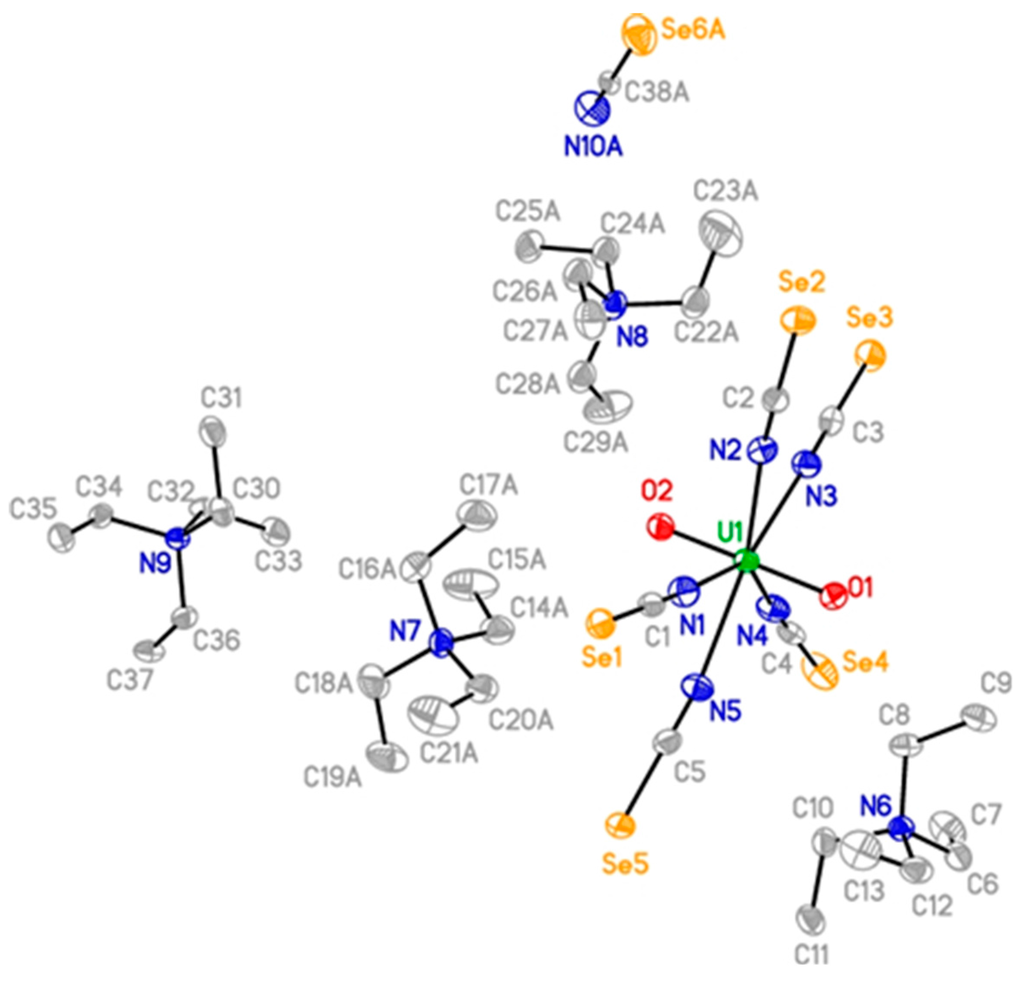 - Crawford, M.-J.; Karaghiosoff, K.; Mayer, P. The homoleptic U(NCSe)84− anion in (Pr4N)4U(NCSe)8·2CFCl3 and Th(NCSe)4(OP(NMe2)3)4·0.5CH3CN·0.5H2O: First structurally characterized actinide isoselenocyanates. Z. Anorg. Allg. Chem. 2010, 636, 1903–1906. [Google Scholar] [CrossRef]