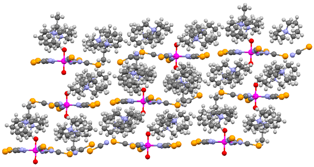 The packing diagram (Figure 2) shows that the structure is a layer type where the cationic components sit between layers of uranyl ions. Hydrogen bonds between the U=O and H–C of the cations link these layers (dC···O = 3.175–3.300Å), as now commonly observed [17]. There are also number of Se···H–C short contacts. The most recent IUPAC definition of a hydrogen bond states that “in most cases, the distance between H and Y are found to be less than the sum of their van der Waals radii” [18]. According to this criterion, and using van der Walls radii taken from reference [19], H···Se distances of less than 3.02 Å are classed as hydrogen bonds. These form a link between the layers via a C–H of an ethyl group and a Se atom in the coordinated and non-coordinated [NCSe] anion (dC···Se = 3.687(16)–3.856(10); C–H···Se = 142°–155°) [20]. Also present in the structure are close contacts between a coordinated selenium atom and the selenium of the non-coordinated [NCSe]− (3.427(1) Å) that are shorter than the van der Waals radii (3.64 Å) [19]. Chalcogen–chalcogen interactions have been studied both experimentally [21,22], and in the case of [NCS]− also for uranyl (S···S = 3.536(2) Å) [15], and theoretically [23,24]. This may explain the difficulty in growing single crystals of 1 as these weak interactions may be important. Further studies are underway in our laboratory and will be reported on in due course.