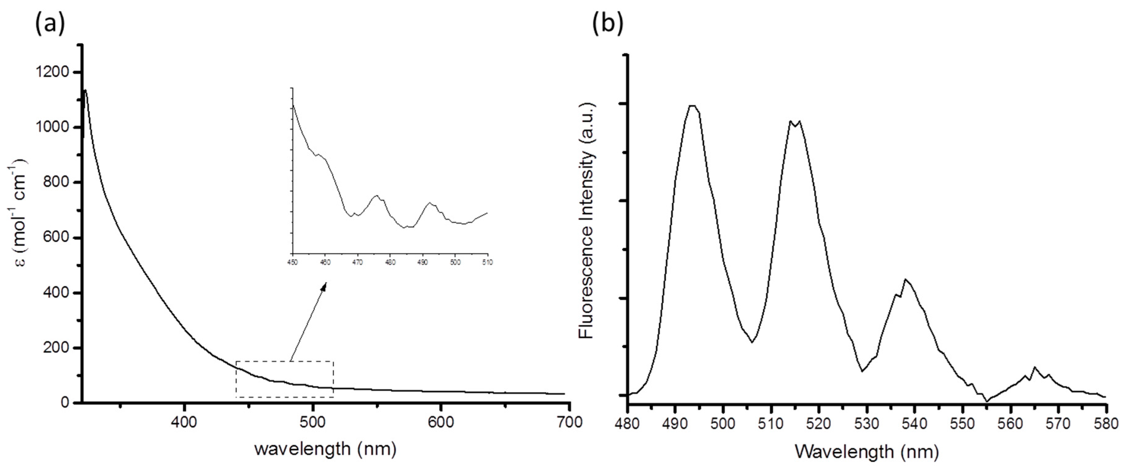 (a) UV-Vis absorption spectrum of 1 in acetone; (b) emission spectrum of 1 in acetone (λex = 340 nm).