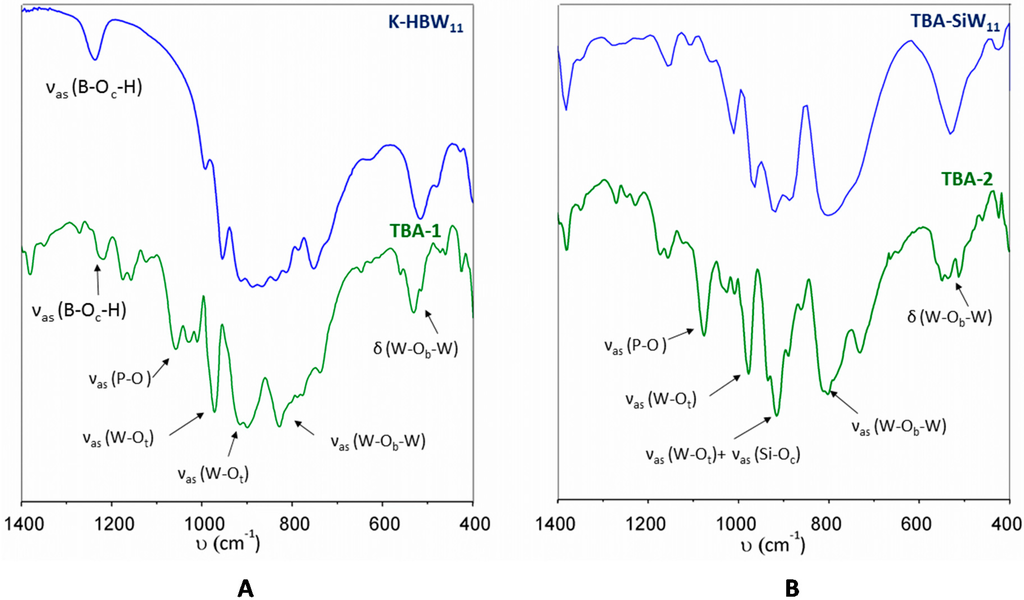 FT-IR spectra of TBA-1 (A) and TBA-2 (B) compared with those of their corresponding precursors K8[HBW11O39]·13H2O and TBA8[SiW11O39].