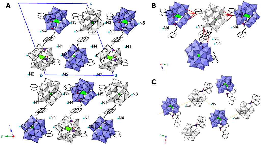 View of the crystal packing of compounds TBA-1 and TBA-2 along the [100] direction (A); Connectivity between POMs through intermolecular C–H···OPOM hydrogen bonds (depicted as red lines) within bilayers (B); Projection of a layer along the [001] direction where the N3 and N5 TBA cations connect POMs of the same z level in a zigzag mode (C). Color code: same as in Figure 2, crystallographically independent POM clusters are depicted in blue and gray. Butyl groups from TBA cations and aromatic H atoms are omitted for clarity.