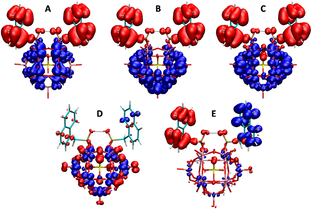 Difference densities for several CT transitions calculated for the hybrid POM 2 at the TDA-B3LYP/def2-SVP//BP86-D3/def2-SVP level of theory. The electronic transfer is from the red to the blue surfaces: (A) 408 nm; (B) 380 nm; (C) 350 nm; (D) 290 nm and (E) 290 nm.