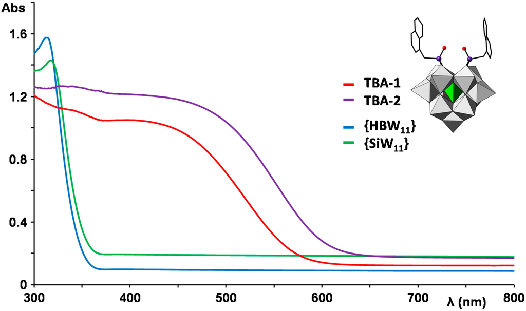 The diffuse reflectance spectra registered for powdered crystalline samples of TBA-1, TBA-2 and their precursors K8[HBW11O39]·13H2O and K8[SiW11O39]·13H2O (Figure 7) confirm the features stated from the solution studies. The bands associated with the monolacunary Keggin anions undergo red shift upon organic functionalization from 313 and 318 nm for the {HBW11} and {SiW11} POM precursors to 336 and 341 nm for the hybrid compounds TBA-1 and TBA-2. Strong charge transfer bands originating from the covalent connection between the naphthyl moieties and the inorganic oxo-cluster can also be observed in the visible region.