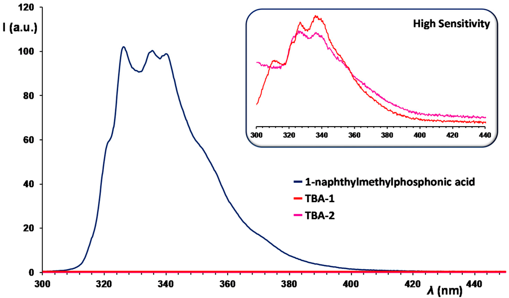 Fluorescence emission spectra of 10−6 M acetonitrile solutions of TBA-1, TBA-2 and 1-naphthylmethylphosphonic acid in the 300–450 nm region (λexc = 283 nm).