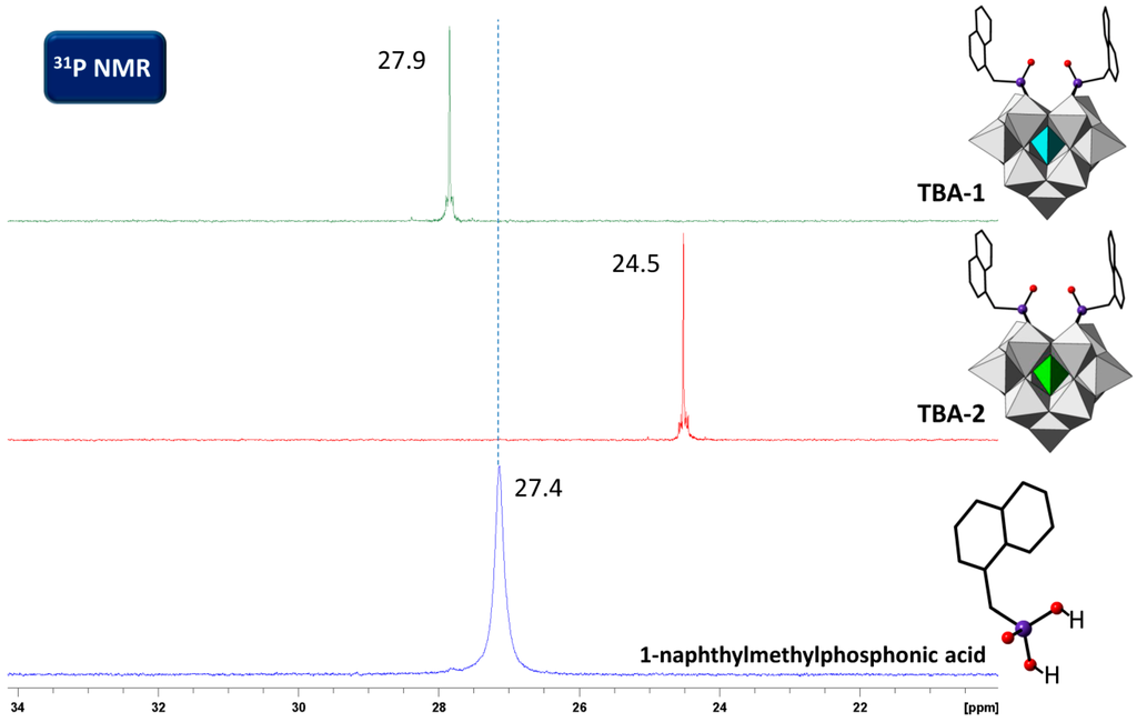In order to investigate the solution stability of the hybrid POMs 1 and 2, we performed 31P-, 1H- and 13C-nuclear magnetic resonance (NMR) studies in deuterated solvents and compared the resulting spectra with that of the commercial 1-naphthylmethylphosphonic acid.
