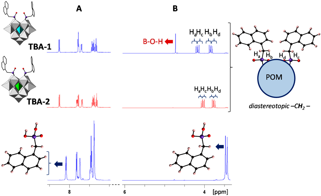 Expanded regions of the naphthyl (A) and methylenic (B) protons in the 1H-NMR spectra of TBA-1 and TBA-2 recorded in acetone-d6 compared with those of the commercial 1-naphthylmethylphosphonic acid. The diastereotopic spin system for the methylenic group in the hybrid POMs 1 and 2 is schematically depicted. The signal assigned to the B–O–H proton is highlighted in red.