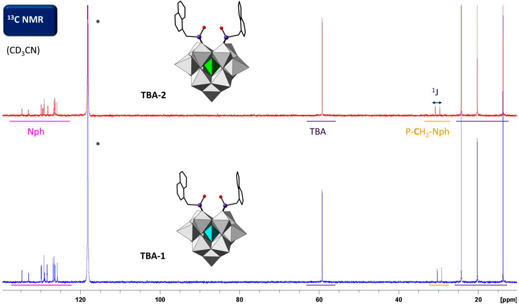 The 13C-NMR experiments were first carried out for deuterated acetone solutions (Figure S5). The TBA cations in compounds TBA-1 and TBA-2 could be easily assigned to singlets appearing at 14 (–CH3), 20 (–CH2–CH3), 25 (–CH2–CH2–) and 59 (–N–CH2–) ppm. The aromatic signals are observed in the 126–135 ppm region. Some of them appear as doublets due to the spin coupling with the close NMR active P nucleus (J = 3–11 Hz). The spectrum of the 1-naphthylmethylphosphonic acid is very similar to that observed for the hybrid POMs with an additional doublet at 32.2 ppm that is ascribed to the methylenic group, which shows a large 1J = 137.5 Hz spin-coupling constant with the vicinal P atom. Unfortunately, the resonances corresponding to this group in compounds TBA-1 and TBA-2 were partially overlapped with the strong signal originating from the solvent and this fact prevented us from performing a full analysis. Therefore, the final 13C-NMR spectra for compounds TBA-1 and TBA-2 were registered using solutions in deuterated acetonitrile (Figure 11). The TBA cations appear as three singlets at 13.9 (–CH3), 20.4 (–CH2–CH3) and 24.4 (–CH2–CH2–) ppm and a resonance at 59.5 ppm for TBA-1 and 59.3 ppm for TBA-2 that corresponds to the C atoms covalently bonded to the N atoms. Close inspection of this resonance reveals an apparent triplet, which is most likely the result of three singlets arising from the three virtually identical but inequivalent TBA cations. The phosphonate groups are observed as follows: one doublet corresponding to the methylene group at ca. 59.4 ppm with 1J = 134.1 Hz for TBA-1 and 1J = 138.3 Hz for TBA-2, together with a set of resonances spanning in the 126–135 ppm region. The positions for singlets and doublets of the aromatic region are virtually identical in both cases: 126.5 (J = 4.5 Hz), 126.6, 126.9, 128.5 (J = 4.5 Hz), 129.2, 129.5 (J = 11.0 Hz), 130.0 (J = 8.0 Hz), 133 (J = 5.5 Hz) and 135 (J = 2.5 Hz) ppm. The spin coupling constants of 11.0, 8.0, and <5.5 Hz have been tentatively assigned as 2J, 3J and 4J, respectively.