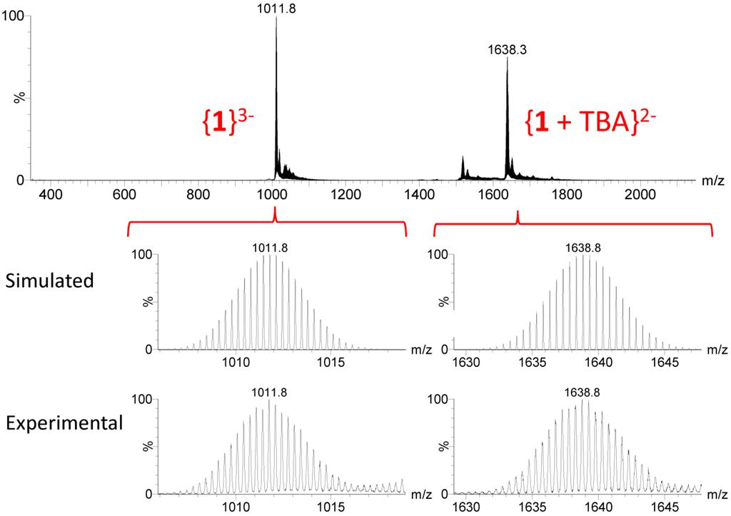 Negative ESI mass spectrum of a CH3CN solution of TBA-1 (Uc = 15 V) and comparison of the signals corresponding to the species {1}3− = [H(C11H9PO)2(HBW11O39)]3− and {1 + TBA}2− = {(C16H36N)[H(C11H9PO)2(HBW11O39)]}2− with the simulated isotopic patterns.