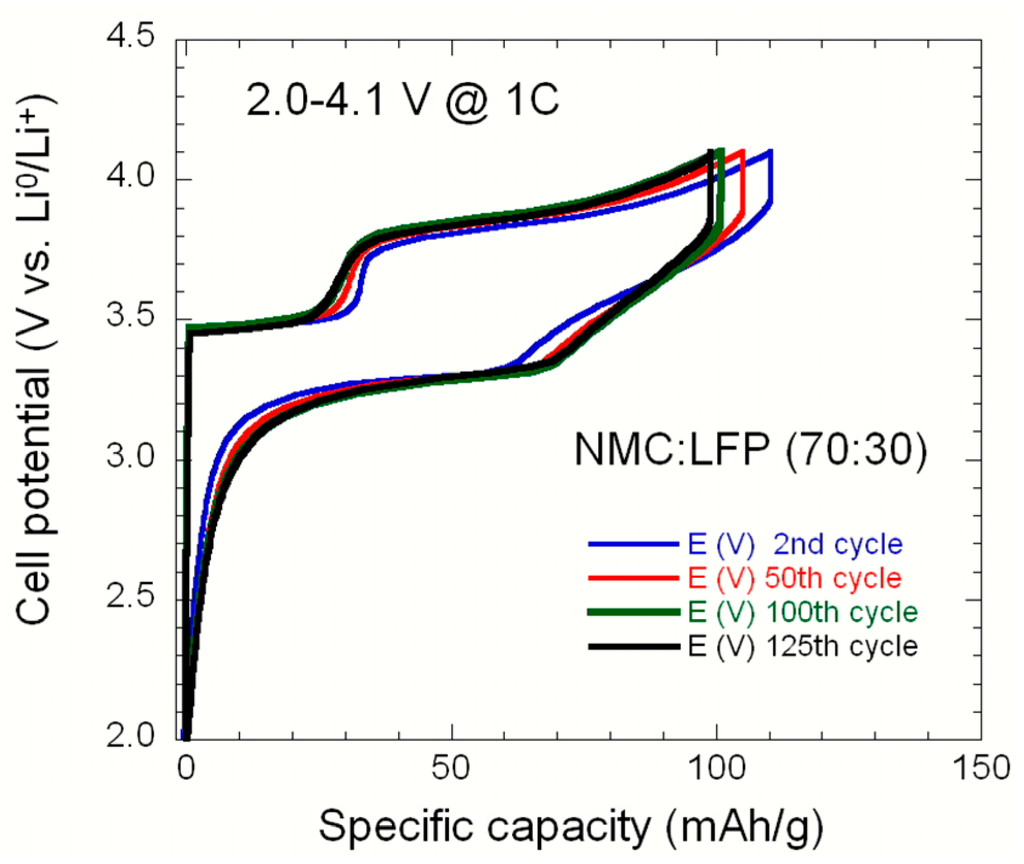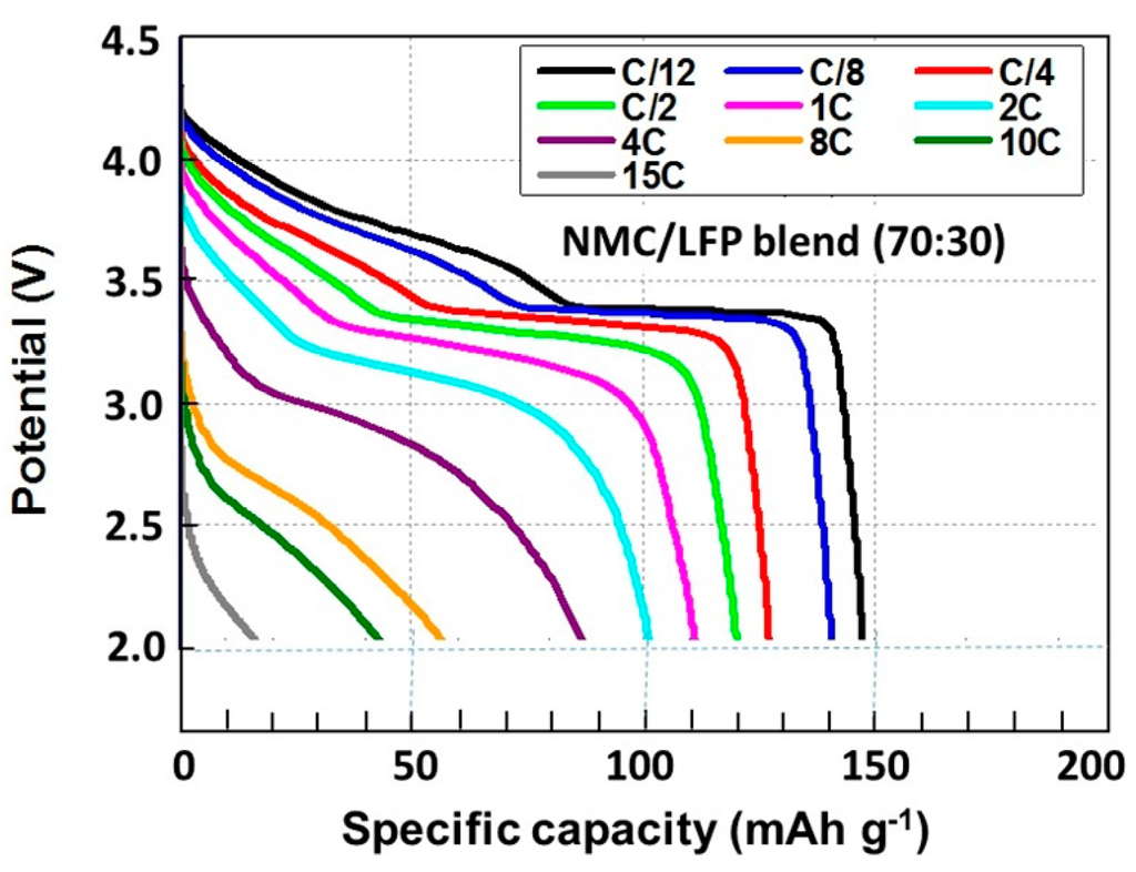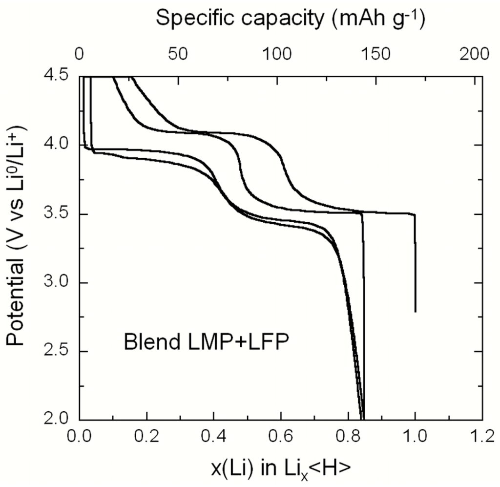 The literature of olivine-based blended active cathode materials is rather sparse. The good thermal stability of olivine-structured compounds LiMPO4 (M = Fe, Mn) makes them attractive cathode materials, but the relatively flat voltage plateau at 3.45 V vs. Li0/Li+ is a limitation, which yields difficult the SOC evaluation. This drawback can be overcome using a blend of olivine with a layered material. Various mixtures have been tested such as the blend of LiFePO4 (LFP) with Li-rich NMC [13,14], which exhibits improved power capability, thermal stability, and easy SOC monitoring. In another approach, a blend of LiFePO4 with Li3V2(PO4)3 (LVP) delivers lower capacity and has a voltage profile consisting of multiple plateaus due to the LVP component [15]. Uniform blends of micron-sized LiMn2O4 with nano-sized LiFePO4 (1:1 mass ratio) prepared by ball milling showed that LFP powders not only cover the LiMn2O4 particles but also effectively fill the cavity of the spinel network [16]. Recently, blend electrodes were prepared by mixing the olivine LiFe0.3Mn0.7PO4 (LFMP) and LiMn1.9Al0.1O4 spinel (LMO) in order to obtain a composite electrode, combining the high capacity of LFMP and the rate capability of the spinel [17].