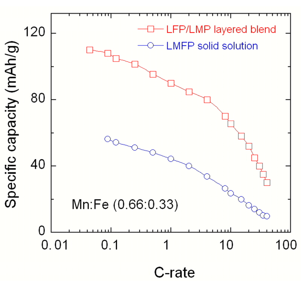 Peukert plot of the LMP–LFP blend compared with the cathode of the same composition formed by the LiMn1−yFeyPO4 (y = 0.33) solid solution.