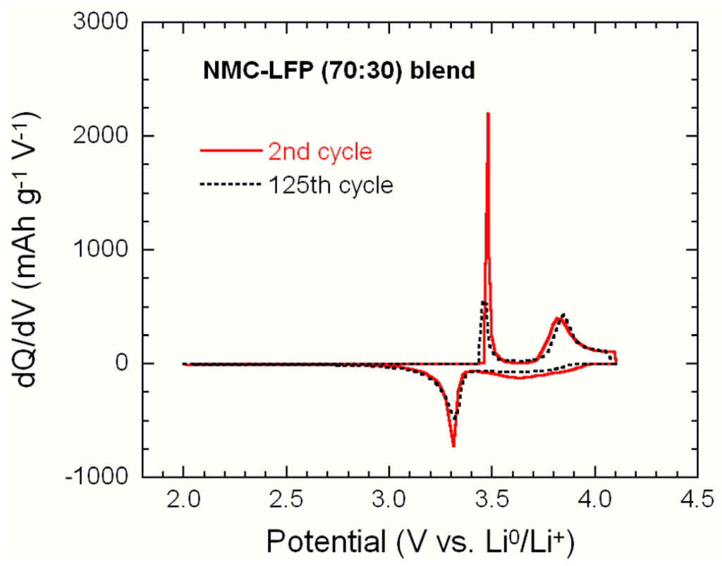 In situ voltage measurement methods have been applied for the evaluation of the phase evolution of blended cathodes and gradual changes in cell behavior upon cycling. Using the so-called incremental capacity (IC) with respect to cell potential, dQ/dV = f(V), and the differential voltage curve dV/dQ = f(Q) could provide such information, since voltage plateaus in the V–Q profile is identifiable by dQ/dV peaks on IC curves [21,22].