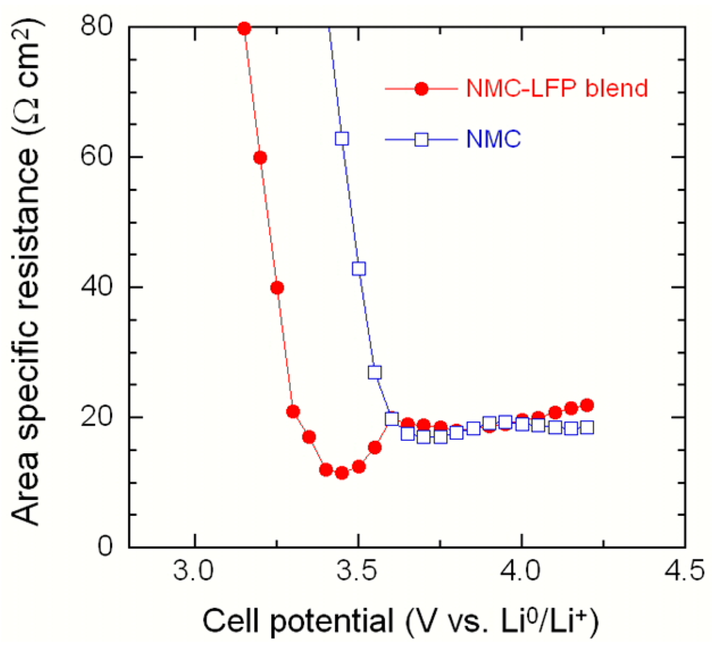 where Voc is the open-circuit voltage, I the current, and A is the electrode area. As presented in Figure 12, the ASR of the NMC cell drops sharply for potential Vcell < 3.5 V, which is an inherent electrochemical feature of layered oxides, while the ASR of the NMC–LFP blend increases sharply at lower potential, ca. 3.25 V. These results show that the blend cathode can deliver high power at low SOC due to the 3.5-V plateau of the discharge curve of LFP.