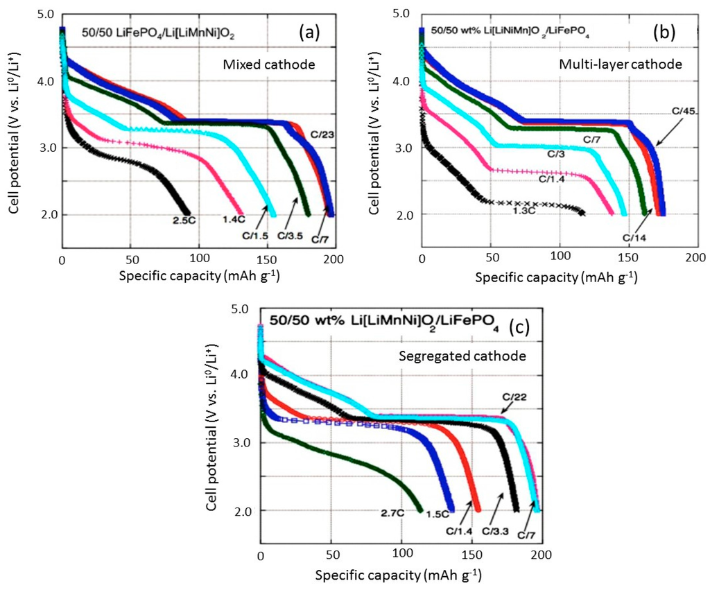 Discharge curves of Li[Li0.17Mn0.58Ni0.25]O2–LFP blended cathodes in different geometries [13]. (a) physically mixed cathode; (b) multilayer cathode and (c) segregated cathode.