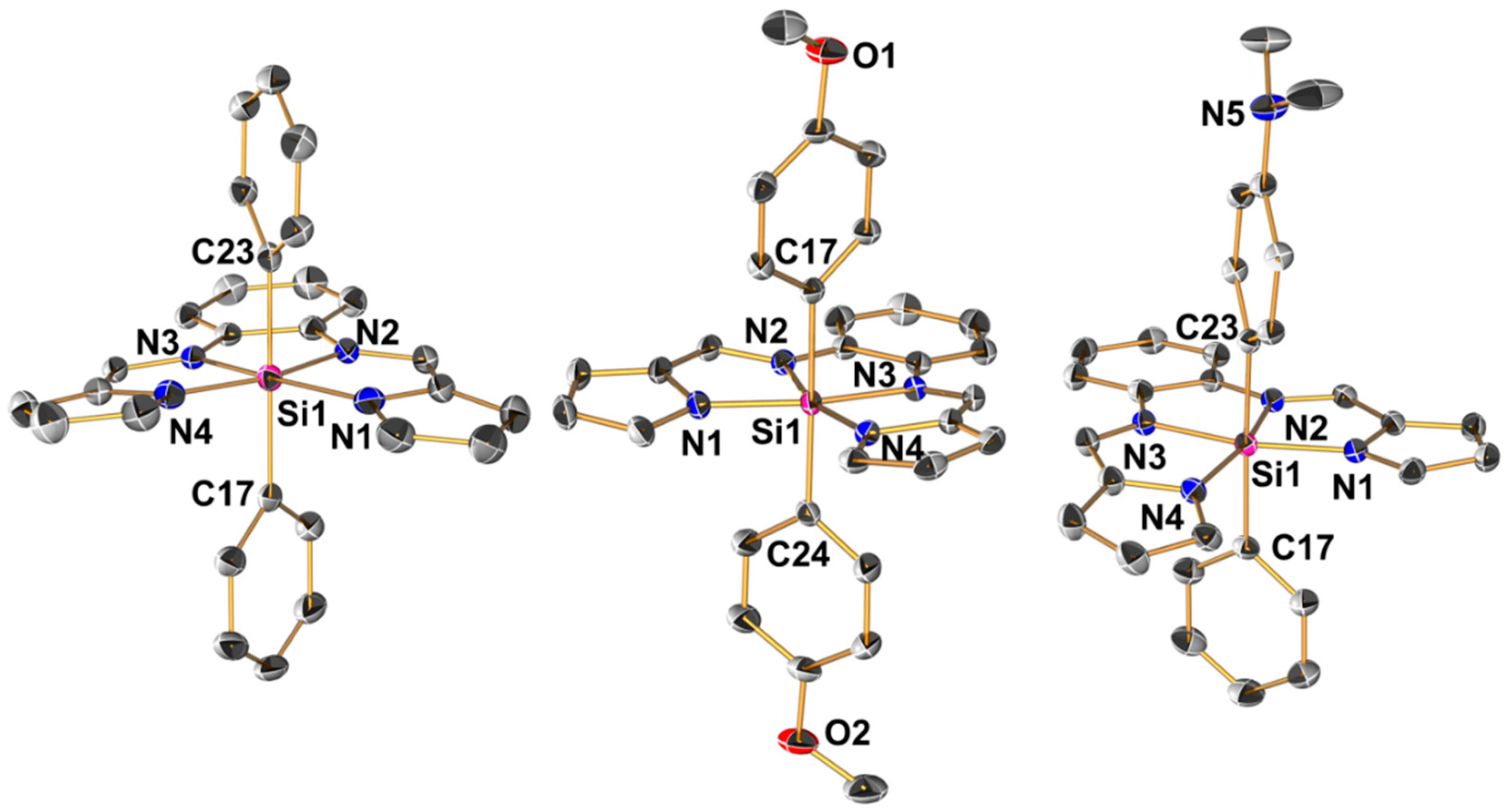 - Wagler, J.; Roewer, G. Intramolecular interligand charge transfer and a red hexacoordinate Si-complex with salen-type ligand vs. colorless tetracoordinate salen-Si-complexes with similar substituents. Inorg. Chim. Acta 2007, 360, 1717–1724. [Google Scholar] [CrossRef]
