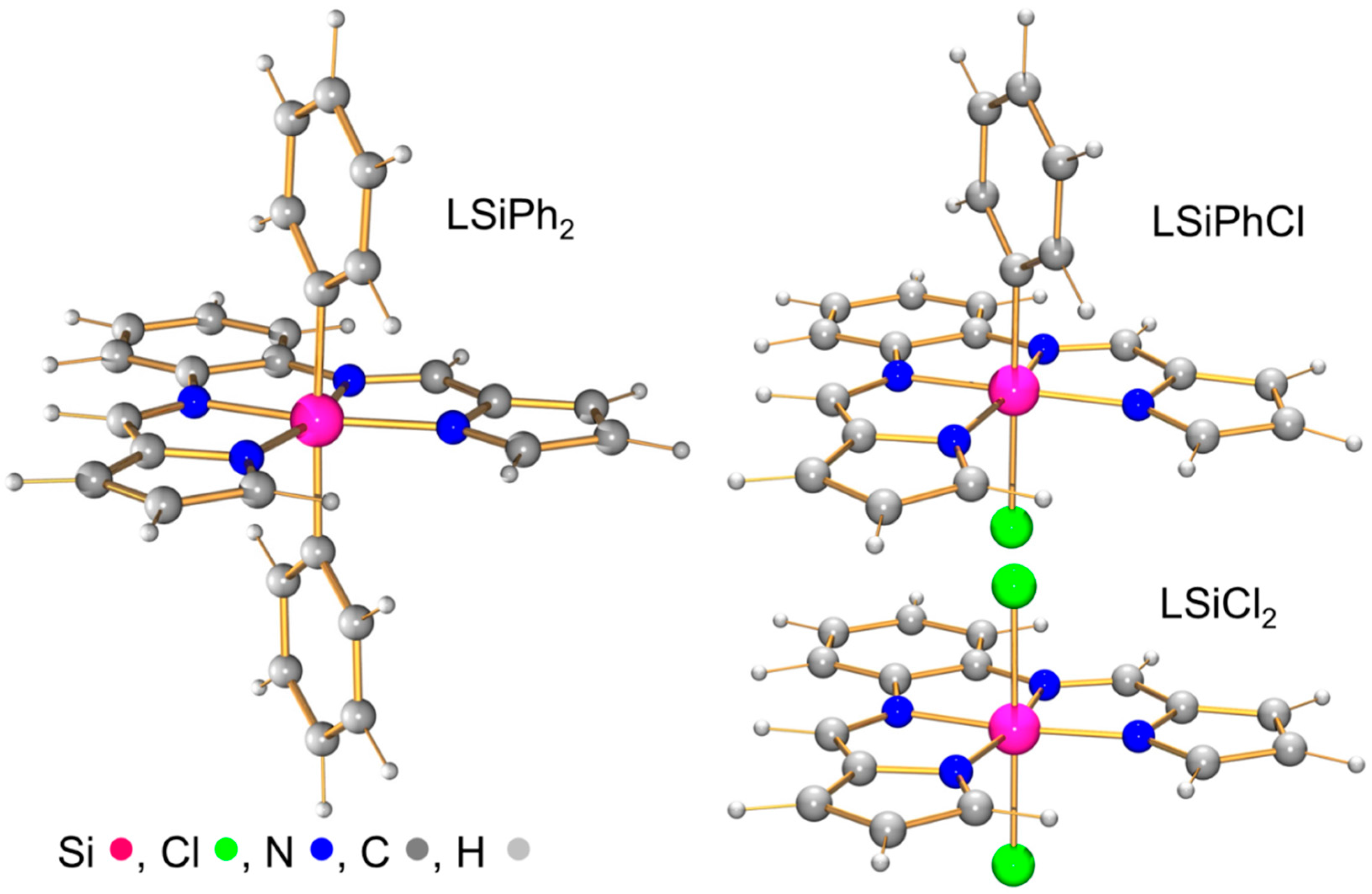In the solid-state compounds LSiPh2, LSi(Anis)2 and LSiPh(4-Me2N-C6H4) exhibit trans-disposed Si–C bonds, which appears reasonable because of the rigidity of the tetradentate chelator. Therefore, the molecular structures of LSiCl2, LSiPhCl and LSiPh2 were optimized starting from a model with trans-disposed monodentate substituents. Direct comparison of the bond lengths found for LSiPh2 in the solid state and predicted by computational methods shows satisfactory agreement, even though the computational analysis appears to underestimate the bond strength to the tetradentate ligand (it predicts longer Si–N bonds) and the weakening of the Si–C bonds resulting therefrom. Thus, we only interpret the trends observed in the optimized molecular structures rather than interpreting the absolute bond length values.