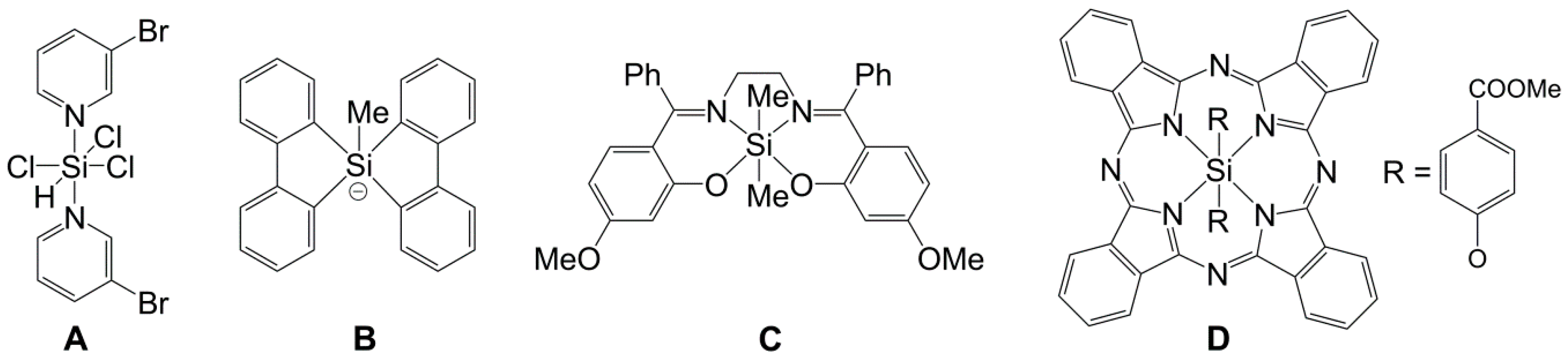 - Peloquin, D.M.; Schmedake, T.A. Recent advances in hexacoordinate silicon with pyridine-containing ligands: Chemistry and emerging applications. Coord. Chem. Rev. 2016. in print. [Google Scholar] [CrossRef]