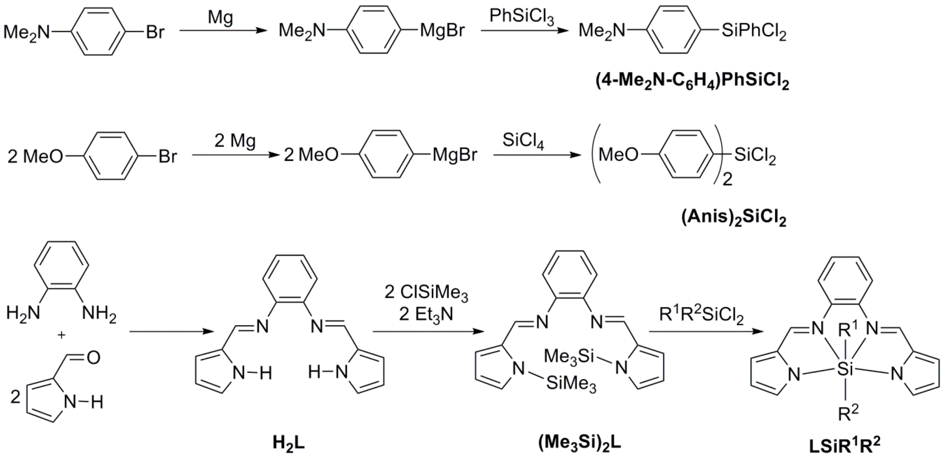 Syntheses of ligands H2L and (Me3Si)2L, silanes (Anis)2SiCl2 and(4-Me2N-C6H4)PhSiCl2 as well as complexes LSiCl2, LSiPhCl, LSiPh2, LSi(Anis)2 and LSiPh(4-Me2N-C6H4).