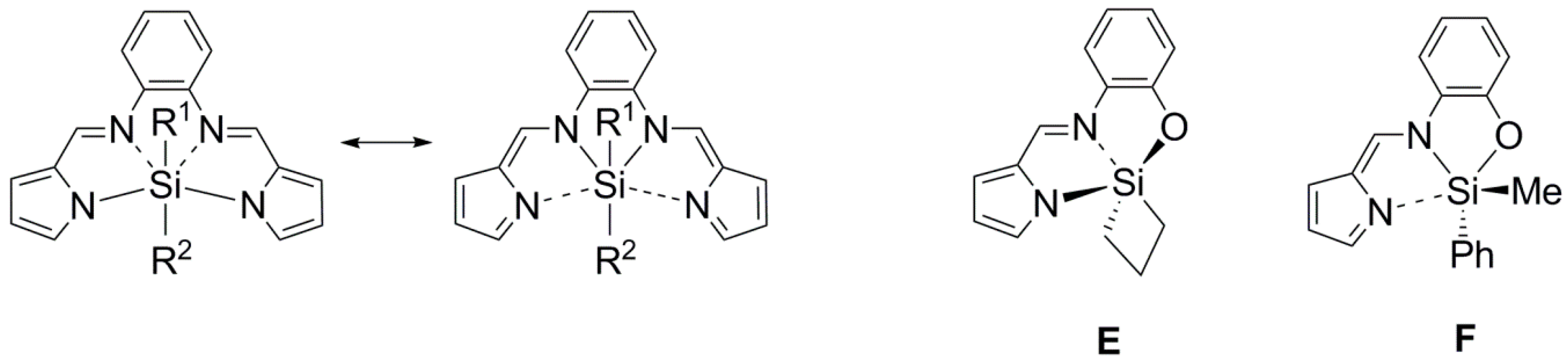 - Gerlach, D.; Brendler, E.; Heine, T.; Wagler, J. Dianion of pyrrole-2-N-(o-hydroxyphenyl)carbaldimine as an interesting tridentate (ONN) ligand system in hypercoordinate silicon complexes. Organometallics 2007, 26, 234–240. [Google Scholar] [CrossRef]