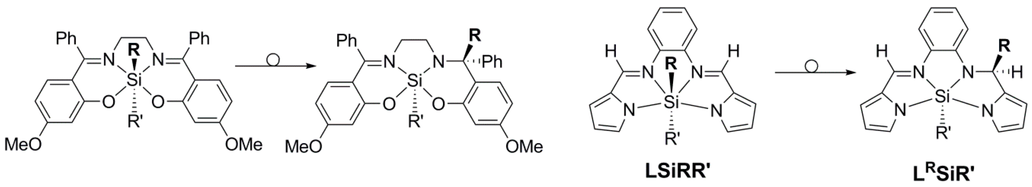UV induced rearrangement of an Si-bound hydrocarbyl group in hexacoordinate Si complexes (migration to an imine C atom) observed for complexes of salen-type ligands (left) and calculated to be thermodynamically allowed for the herein reported diarylsilicon complexes LSiRR′ (right). Rearrangement energies calculated for the following combinations R,R′ are: Ph,Ph: −34.1 kcal·mol−1; Anis,Anis: −34.7 kcal·mol−1; (4-Me2N-C6H4),Ph: −35.6 kcal·mol−1; Ph,(4-Me2N-C6H4): −34.4 kcal·mol−1.